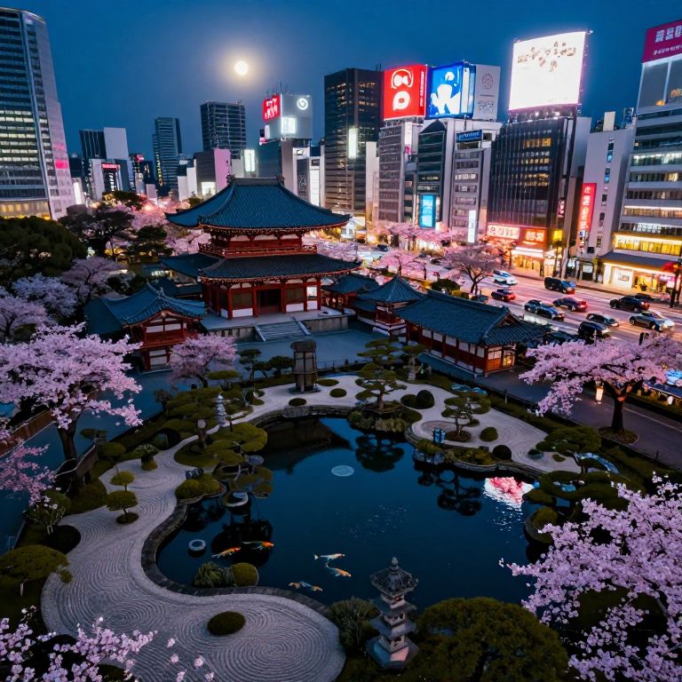 A vivid scene showcasing an aerial perspective over an ancient temple nestled amidst tranquil koi ponds and meticulously raked sand patterns of a serene Zen garden. This peaceful setting is dramatically juxtaposed with the neon-lit chaos of towering skyscrapers and bustling streets filled with modern Japanese vehicles and illuminated billboards in the background, creating a surreal fusion of calm nature and vibrant urban life. Soft moonlit glow filters through cherry blossom trees that gracefully blend into the skyline, evoking an emotional gradient of harmony between ancient traditions and contemporary innovation. The detailed interplay of light and shadow captures both the serenity of the garden and the energetic vibe of the cityscape, inspiring a sense of awe and wonder at the artistic fusion of contrasting elements.