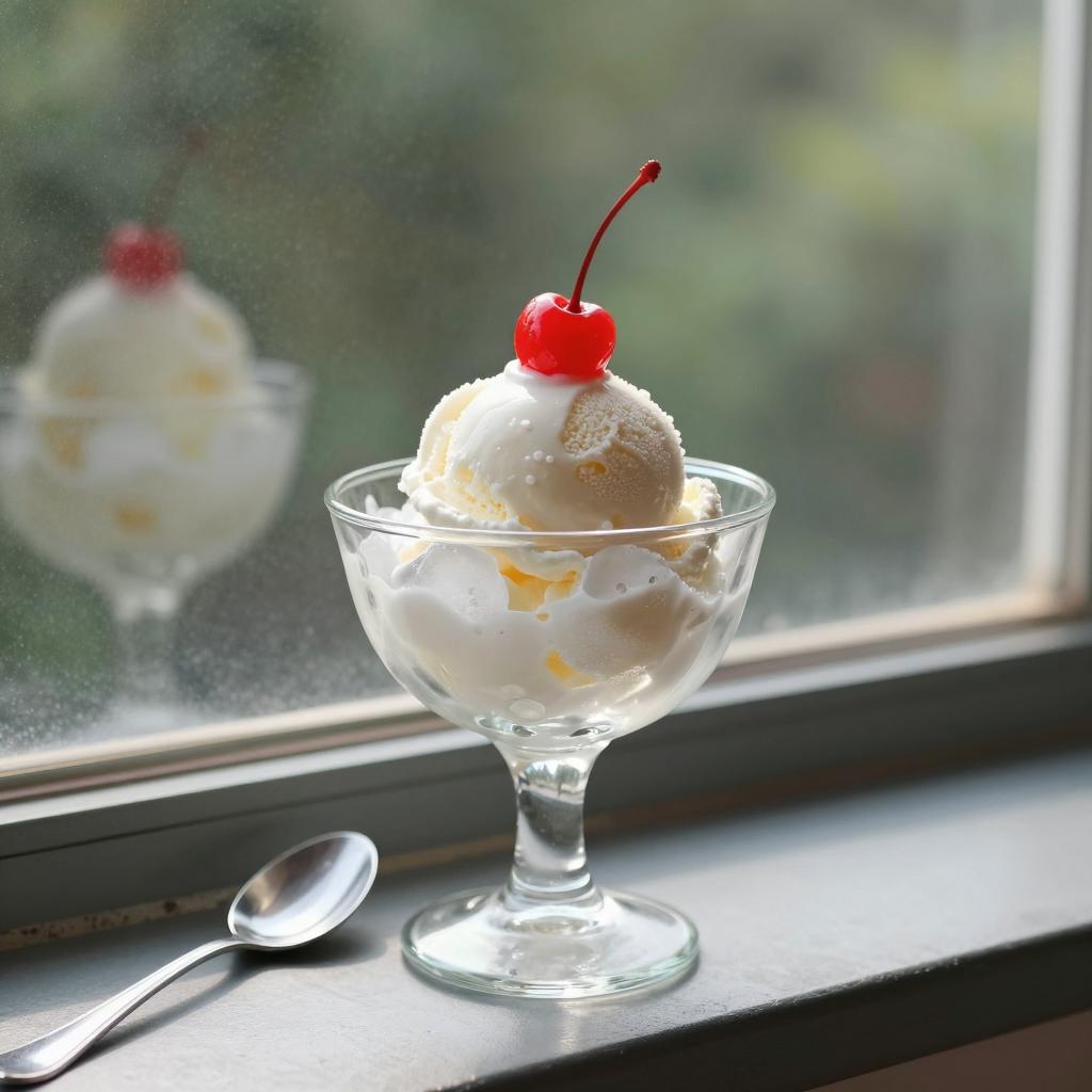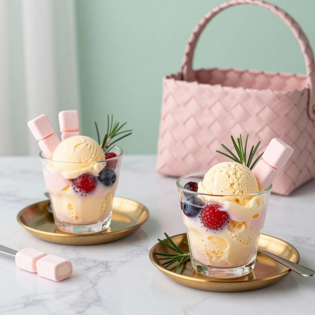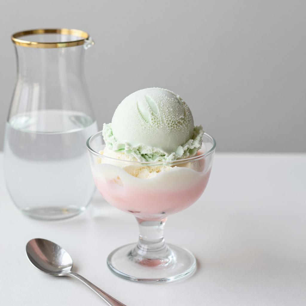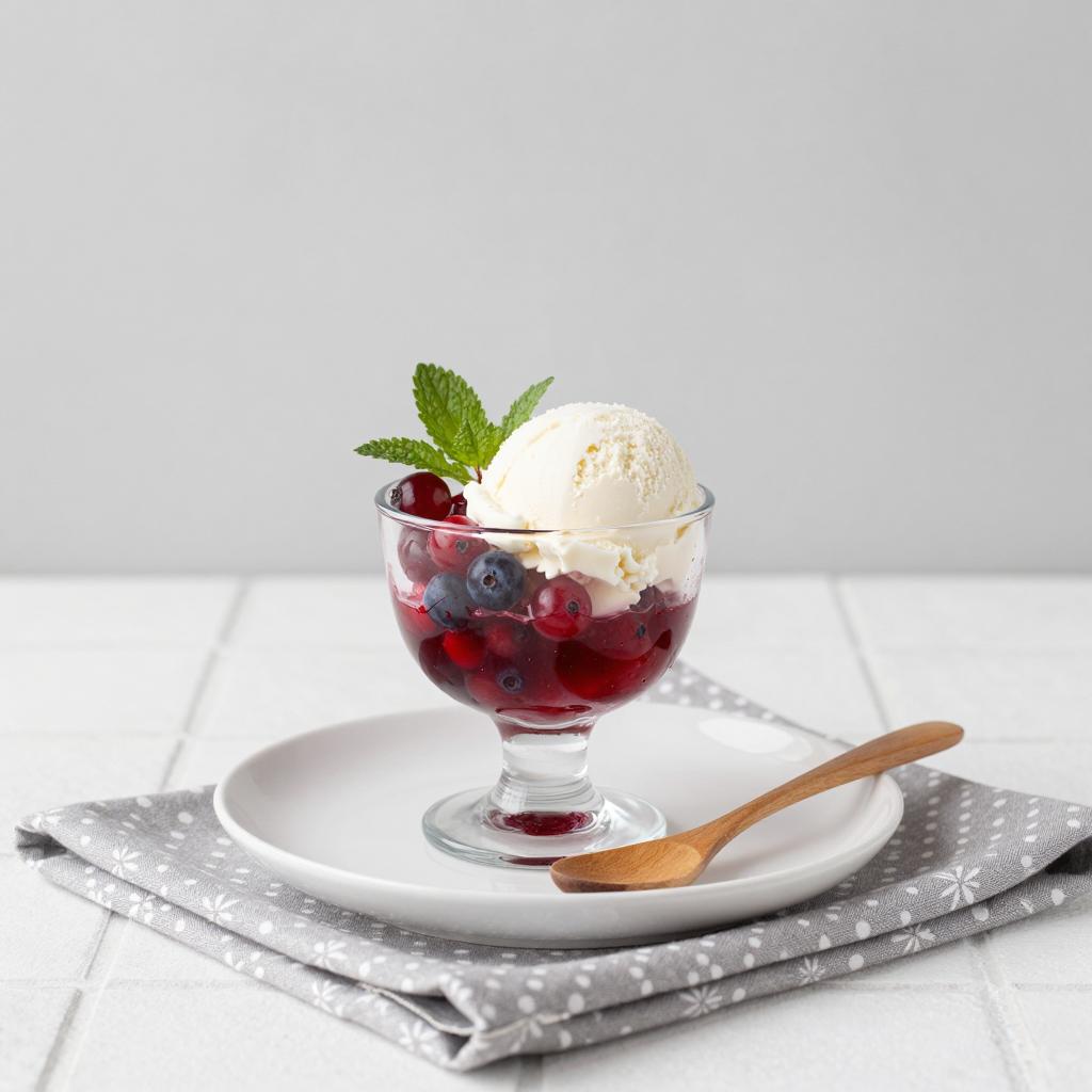 Glass cup with red berries, white ice cream scoop, and green herb, on a white plate with wooden spoon. Gray tablecloth with white pattern. White tiled surface. Plain light gray background.