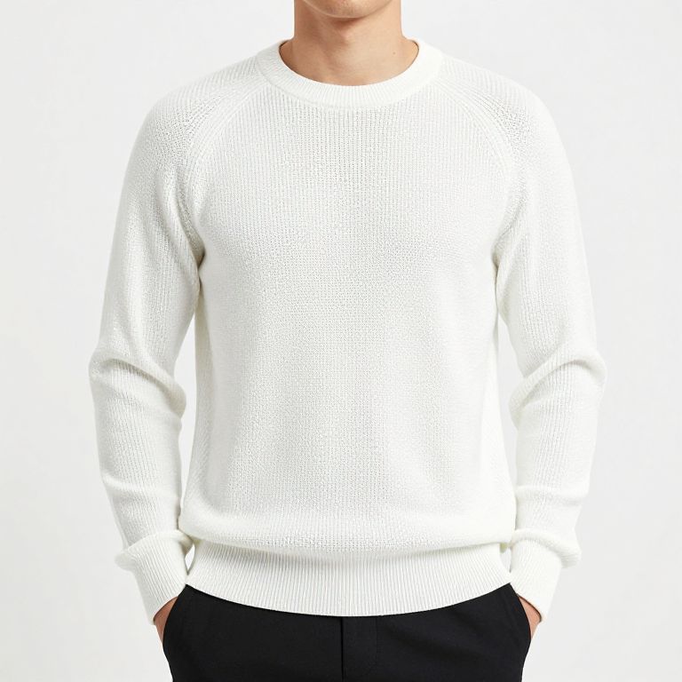 Photograph of a person from the neck down, wearing a white, long-sleeve, knitted sweater with a subtle grid pattern. The sweater has a simple, round neckline and fits comfortably. The person's hands are in their black pants pockets. The background is plain white, making the sweater the focal point. The person's face and hair are not visible.