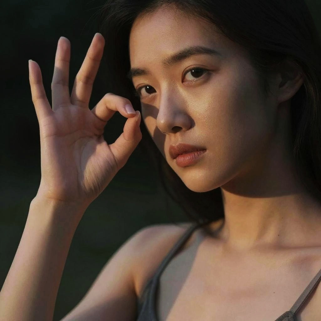 Close-up portrait of a young Asian woman with smooth skin, dark hair, and medium breasts, wearing a sleeveless top. She is outdoors at night with soft, cinematic lighting highlighting her face and collarbone. The woman is making the OK sign with her right hand, captured in sharp focus with a dynamic angle, emphasizing fine skin details.