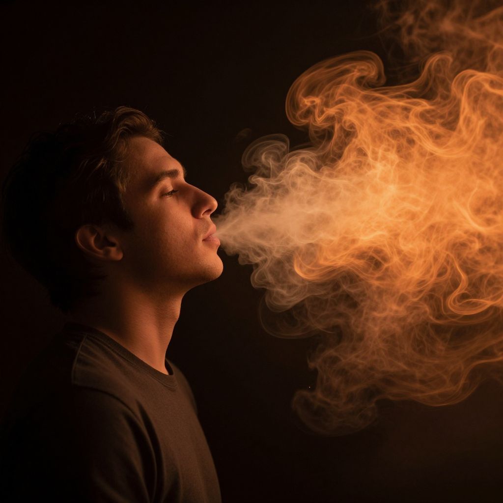 Photograph of a young man with short brown hair, black shirt, exhaling a large, orange, swirling cloud of smoke against a black background.