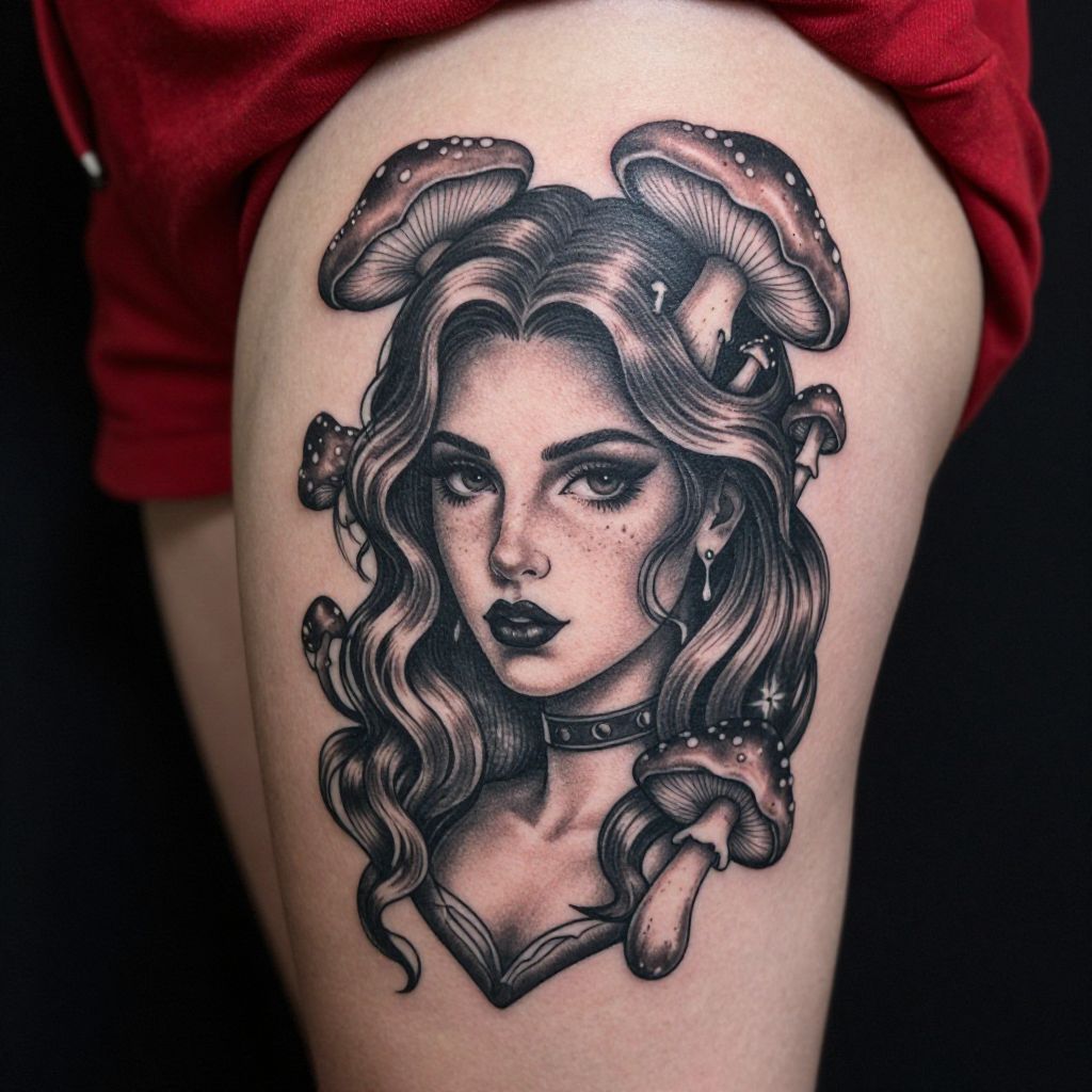 This is a black and gray tattoo on a person's upper thigh. The tattoo features a detailed, fantastical portrait of a woman with wavy hair adorned with mushrooms. She has dark, dramatic eyes, full lips, and freckles, and wears a choker. Her hair and mushrooms are intricately shaded, giving a three-dimensional effect. The person is wearing a red fabric, visible at the top of the image.