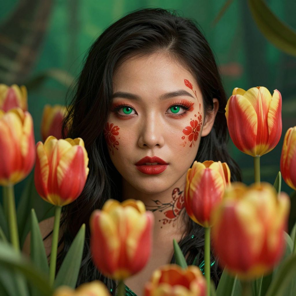 A digital artwork featuring an Asian woman with long black hair and green eyes, surrounded by yellow and red tulips. Her face is adorned with red floral tattoos, matching her red lipstick. The background is a blurred green, suggesting a garden setting. The tulips are in sharp focus, their petals vibrant against the woman's fair skin and the dark green foliage. The woman's expression is calm, and she gazes directly at the viewer, creating an intimate, enchanting atmosphere. The style is realistic with a slightly ethereal, fantasy-like quality.