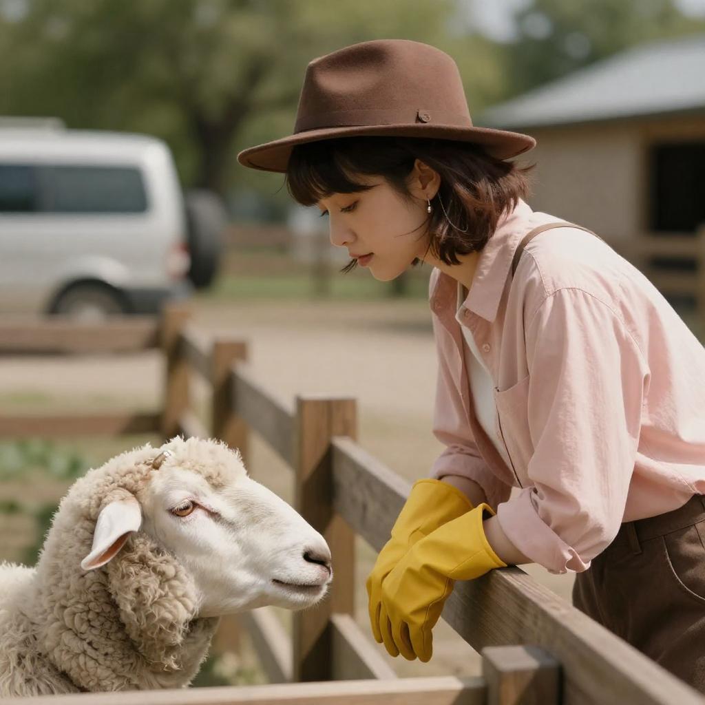 Photograph of a young woman with short brown hair, wearing a brown hat, pink shirt, and yellow gloves, leaning on a wooden fence. She looks at a white sheep in the foreground. Background has green trees and a blurred vehicle. She has a relaxed expression. Sunlight casts gentle shadows.