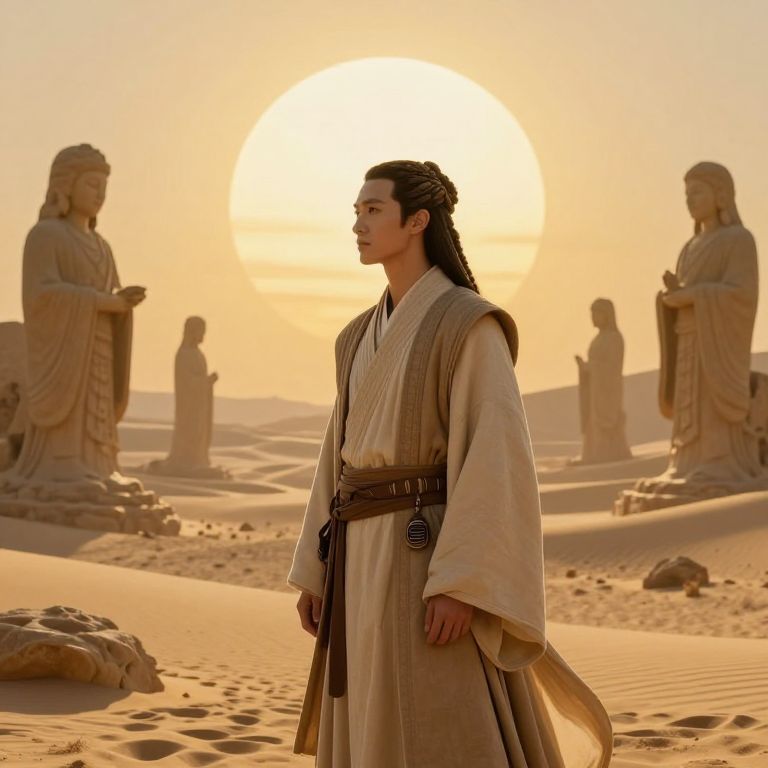 A Padawan with intricately braided hair stands serenely amidst a surreal desert landscape carved with ethereal, otherworldly statues, bathed in the golden glow of an alien sun.