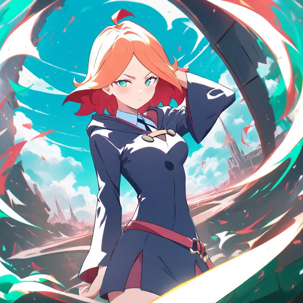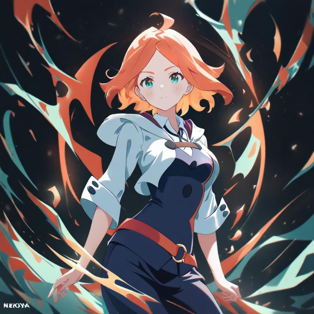 Amanda o'neill, little witch academia, 1girl, green eyes, short hair, orange hair, two-tone hair, red hair, ahoge, medium breasts, by artist nekoya (liu), animagine