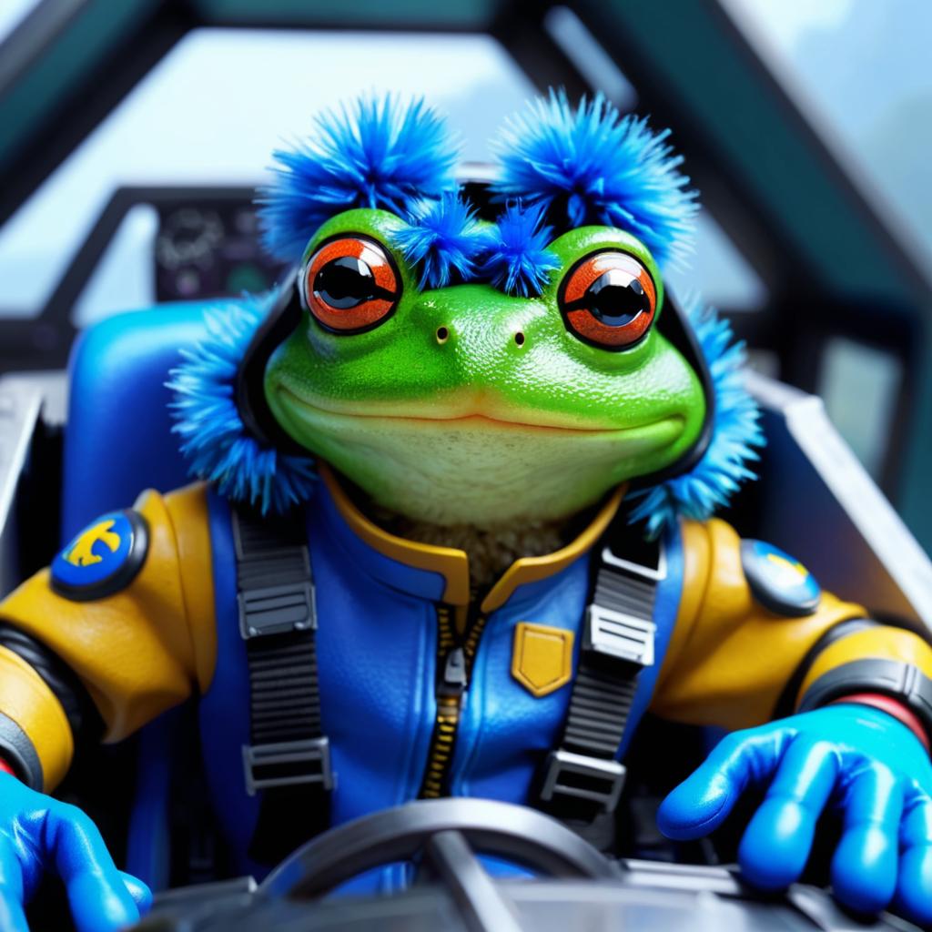 Frog, solo, no humans, blurry, black eyes, male focus, blue gloves, furry, gloves, cockpit, 1boy