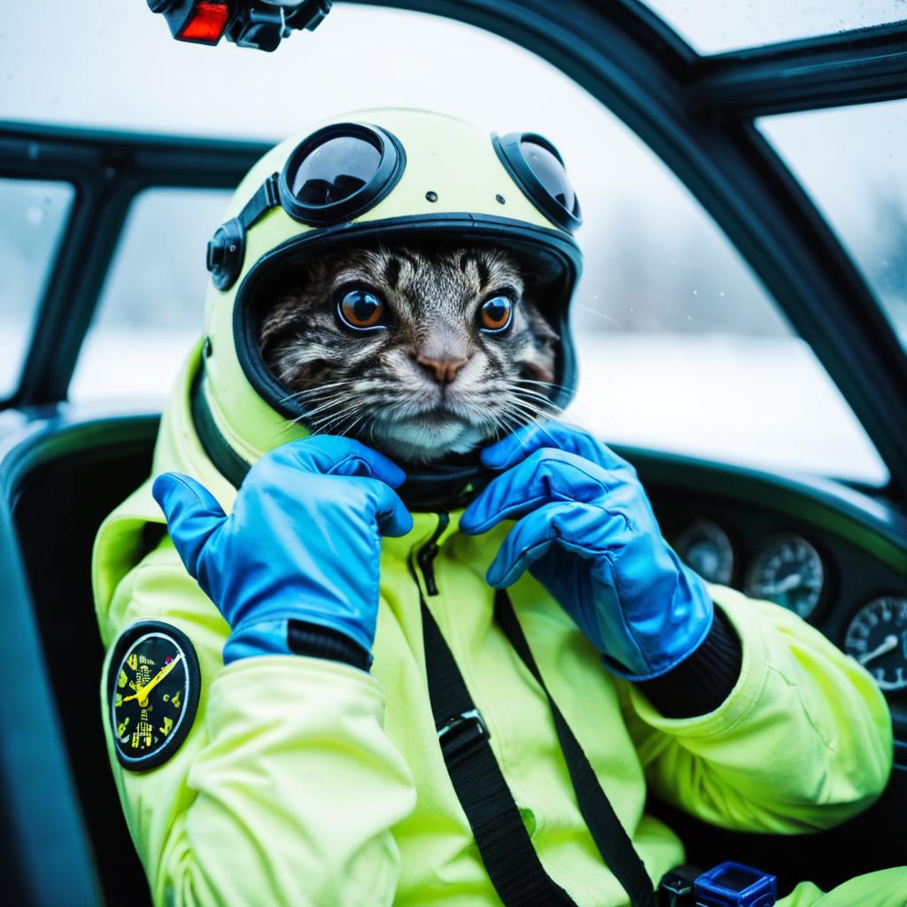 Cat Wearing Pilot Helmet and Blue Gloves in Cockpit