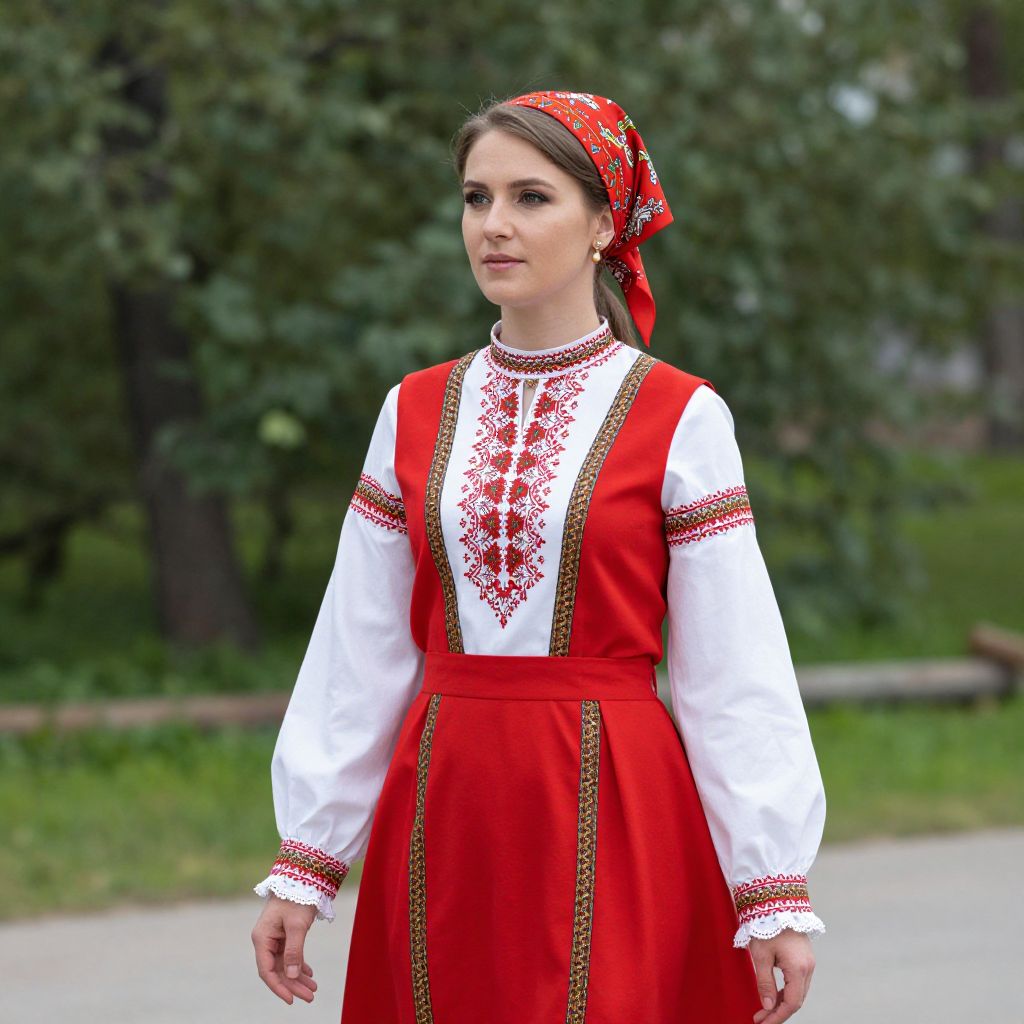 Russian National Costume, woman in a red and white dress with a red head scarf