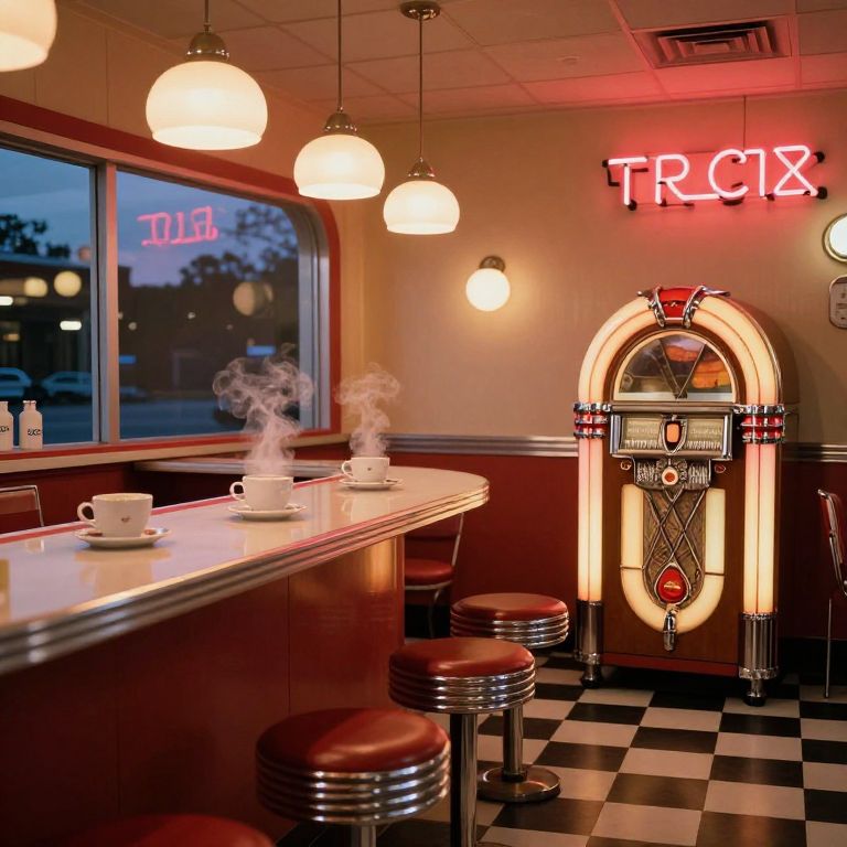 Dineria, a cozy retro diner at dusk with neon signs glowing, classic checkered floors, chrome stools at the counter, warm ambient lighting, vintage jukebox playing, steam rising from coffee cups, detailed 1950s Americana style