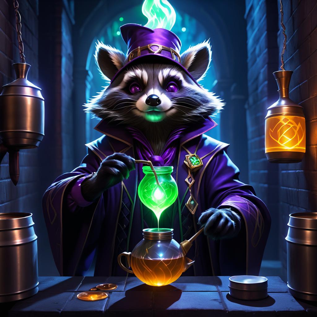 Anthropomorphic Raccoon Wizard Brewing Potion