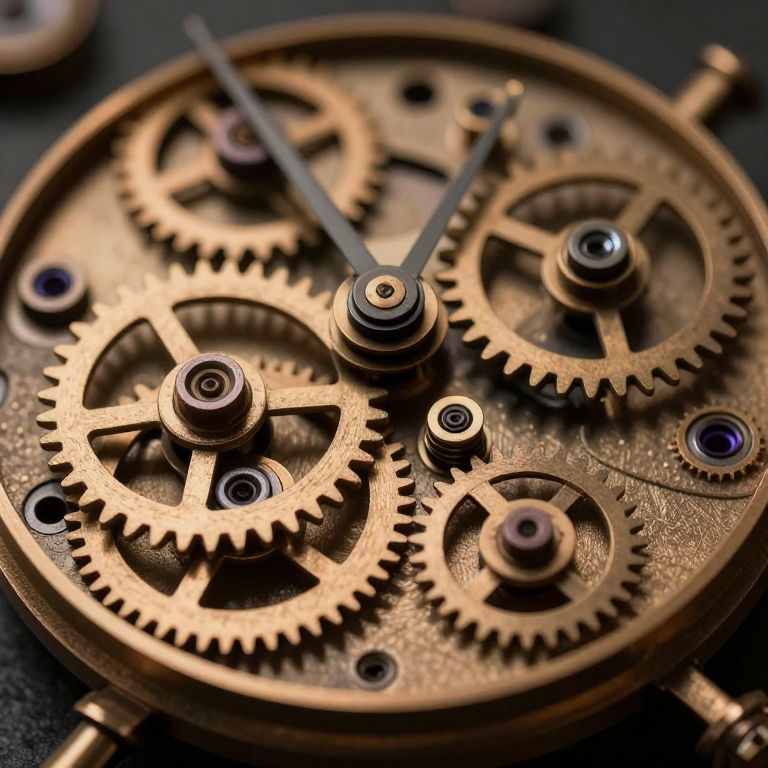 Analoge clockwork mechanism with visible gears and springs, macro shot with shallow depth of field, warm bronze tones, steampunk aesthetic, intricate craftsmanship and mechanical precision, softly glowing ambient light