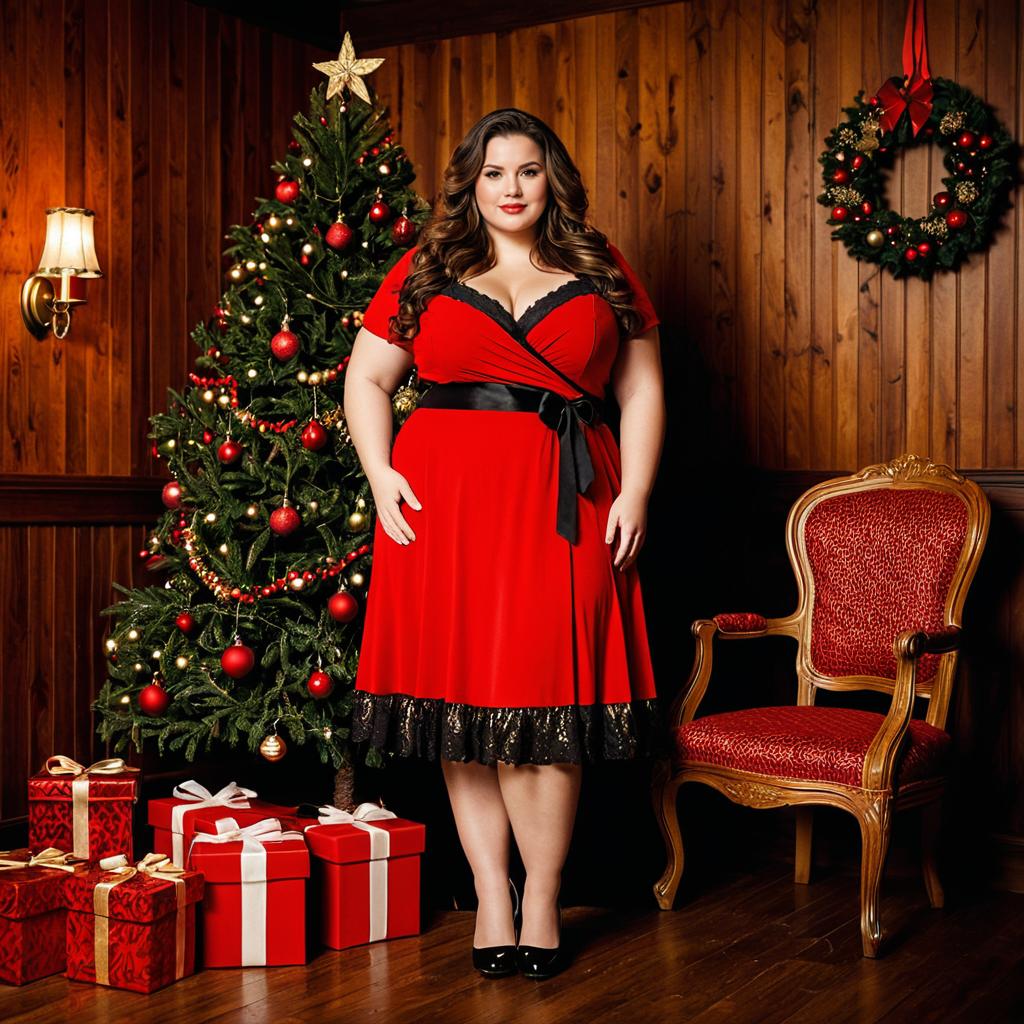 Full-body portrait of a plus size woman with long brown wavy hair wearing a red dress with black lace trim and a black belted waist. She stands confidently in front of a decorated Christmas tree with red and gold ornaments and surrounded by red wrapped gifts. The background features a wooden wall with a Christmas wreath and a red upholstered vintage chair. Warm, festive holiday lighting enhances the cozy atmosphere.