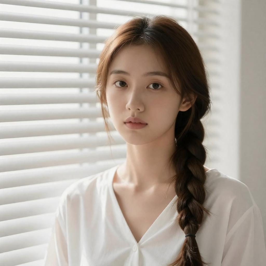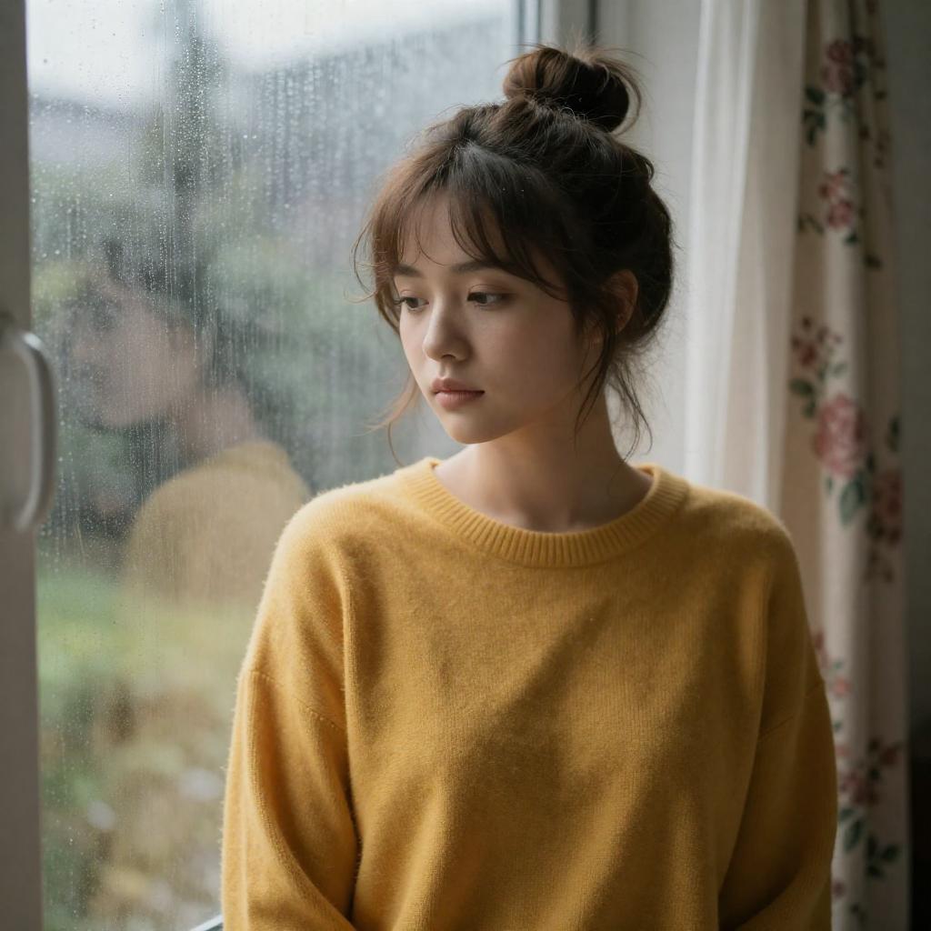 Young woman with medium brown hair in a messy bun, wearing a mustard-yellow sweater, stands by a rain-streaked window. Floral curtains on the right. She looks downward with a neutral expression. Soft indoor light. Background blurred.