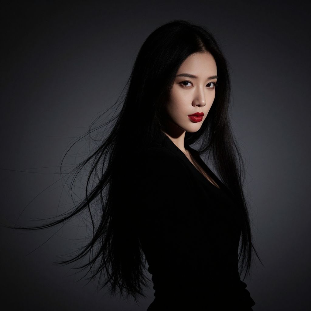 Silhouette Art, dark background, inksplash portrait of stunning oriental woman, long hair, seductive, sultry, lustful, red lips, direct gaze, light hitting one side of face, gradient colour background