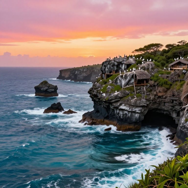 Laysan steep cliffs rising above crystal-clear ocean waves, seabirds nesting on rocky outcrops, vivid sunset sky blending pink and orange hues, serene island atmosphere, detailed nature illustration with high resolution
