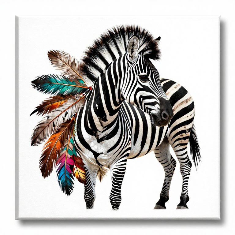 Digital illustration of a zebra with distinct black and white stripes, adorned with a colorful array of feathers. The feathers, in shades of brown, orange, red, blue, and green, are attached to the zebra's left side, creating a striking contrast against its monochrome pattern. The zebra stands facing slightly to the right, with a detailed, textured mane. The background is pure white, making the zebra and feathers the focal points. The style is modern and vibrant, with a clear emphasis on bold colors and patterns. The image is framed with a thin, black border.