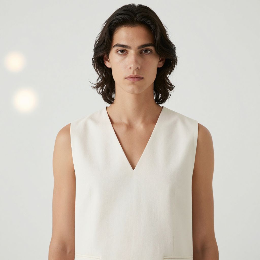 A model with sharp angular features and dark wavy hair wearing a minimalist v-neck vest in off-white cotton, standing against a clean white backdrop with soft bokeh lights in the background, emphasizing the subtle V-shaped neckline and clean lines.