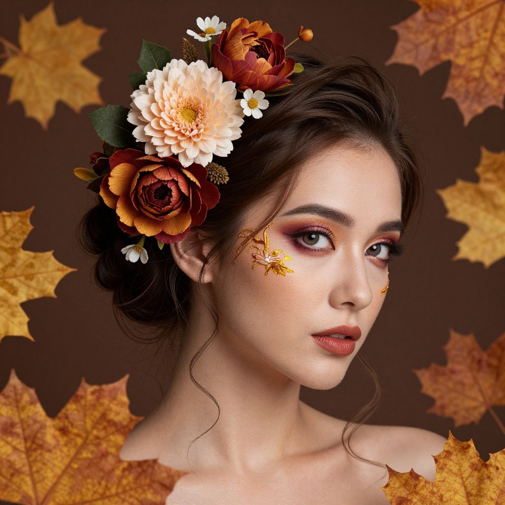 A woman with intricate floral hairpiece and face art, surrounded by autumn leaves and flowers.