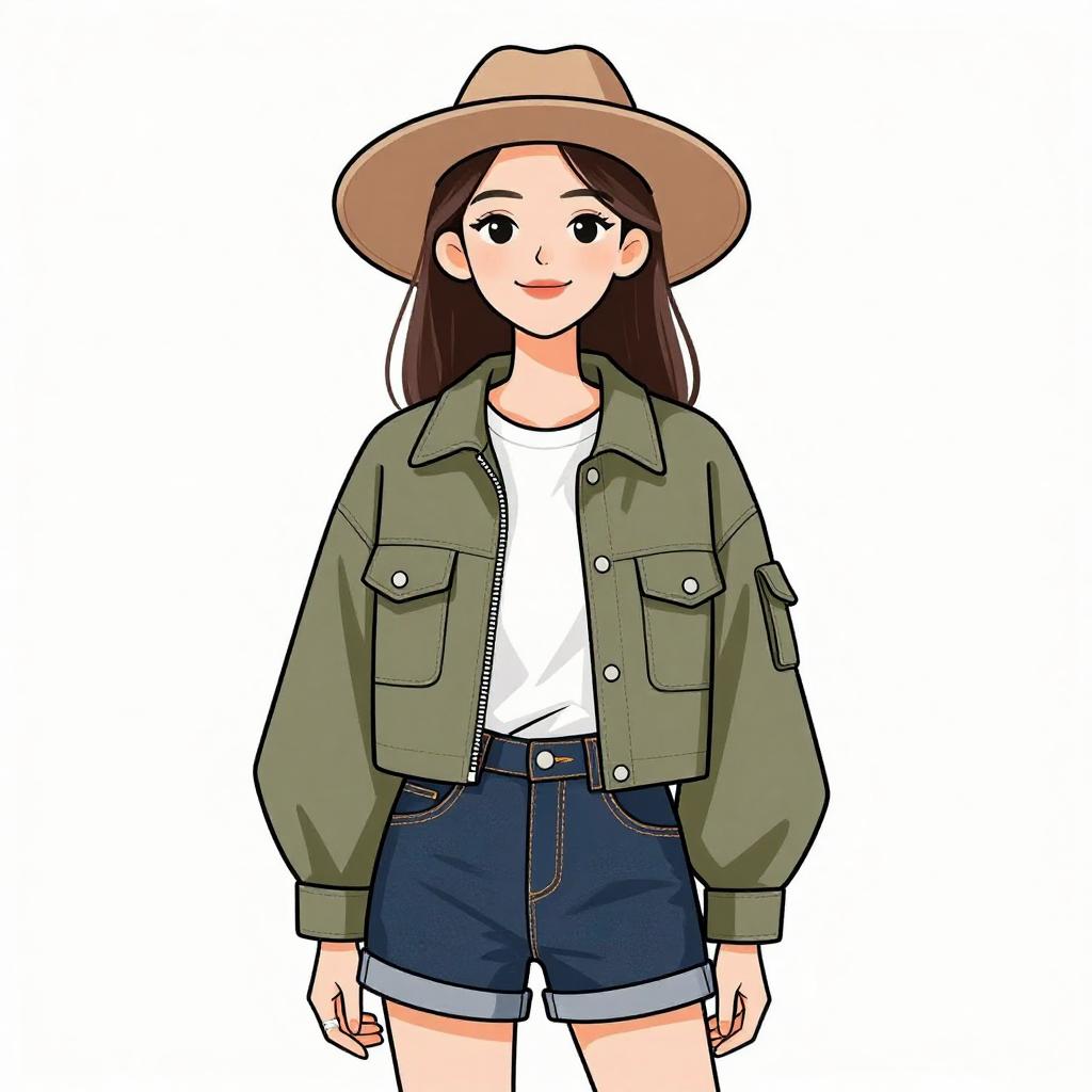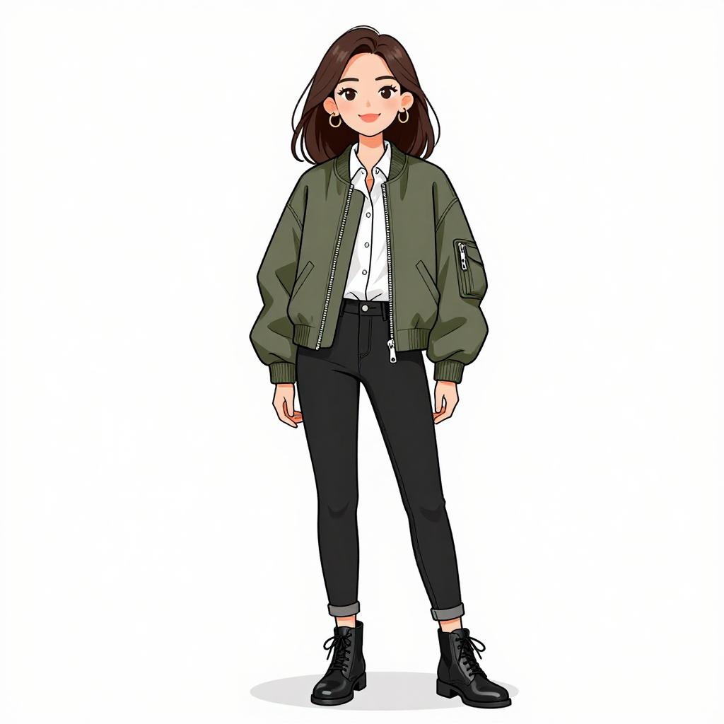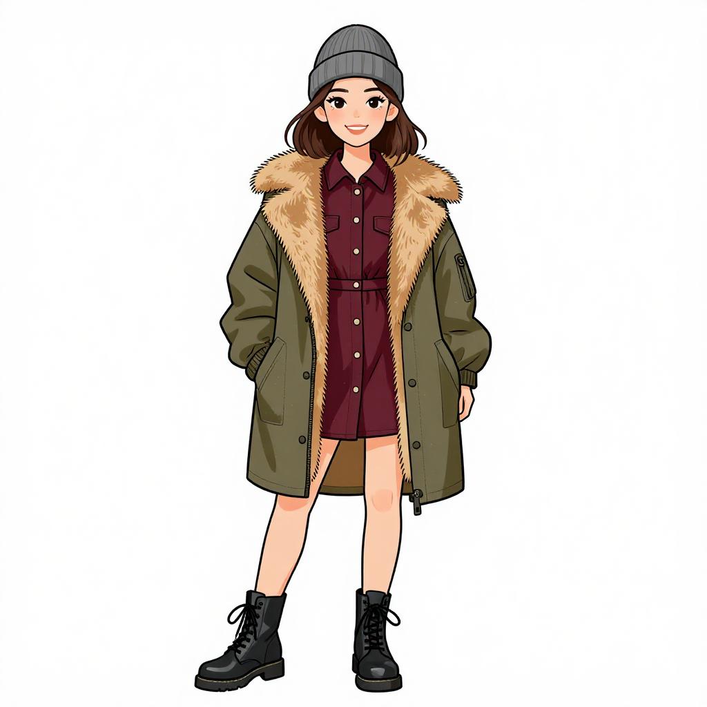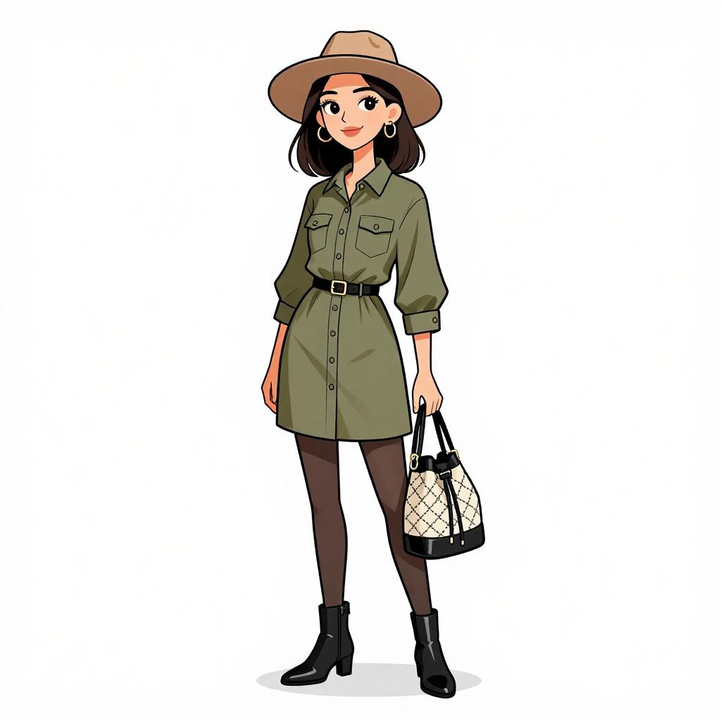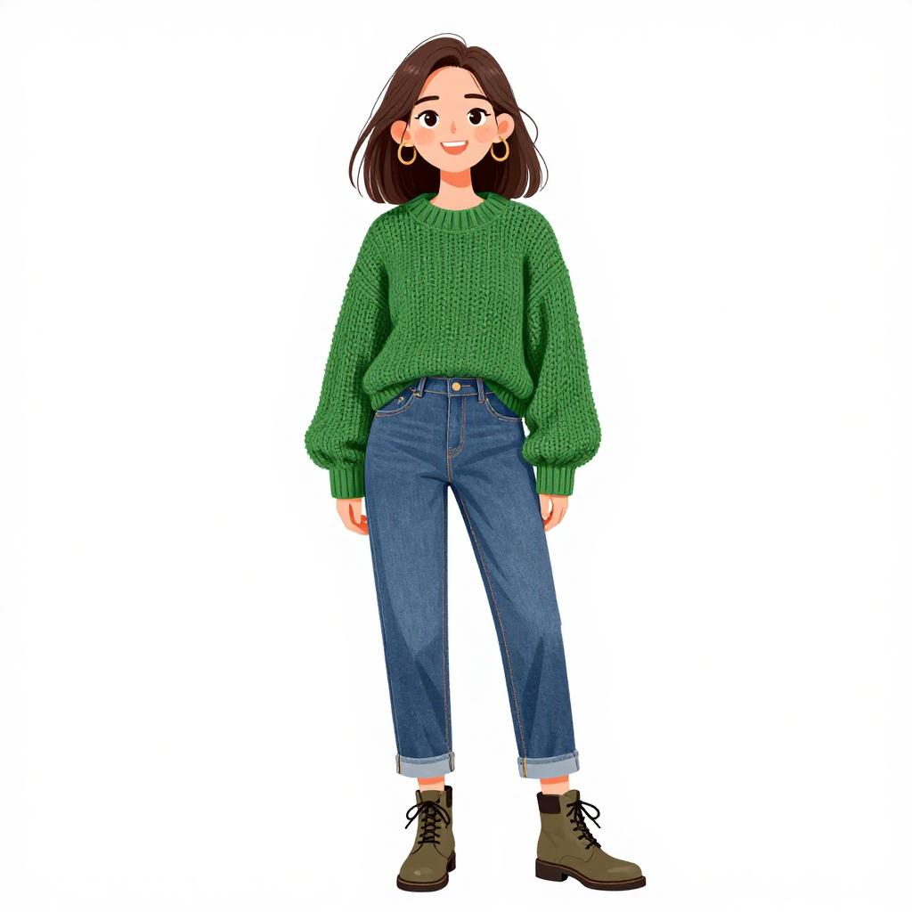 Woman with pretty face and pretty hair. smiling Woman, casual streetwear, oversized mint green cable knit sweater, dropped shoulders, ribbed cuff sleeves, mock neck, sage green faux leather mini skirt with center seam and stitch detailing, black lace-up combat boots with a chunky sole, olive green fisherman's cap, white background. --sref 1467