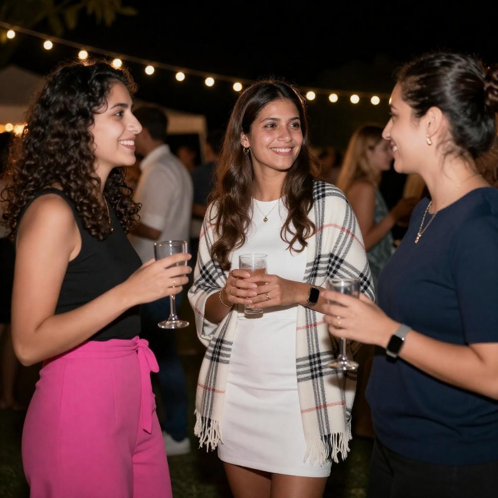 Black-and-white photograph of a crowded nightclub scene. Five people, three men and two women, stand close together, engaged in conversation. The man in the center wears a white shirt and dark pants, with curly hair. The woman to his right has long dark hair and wears a dark dress. Background shows blurred figures and bright lights.