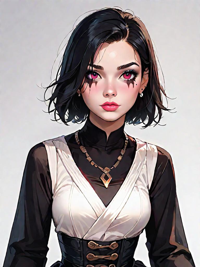 1girl, source_comics, realistic face, full body shot, Woman, contemporary, magenta crop top with drawstring front, short puff sleeves, scoop neckline, matching high-waist miniskirt, straight cut, plain fabric, choker necklace, white background.