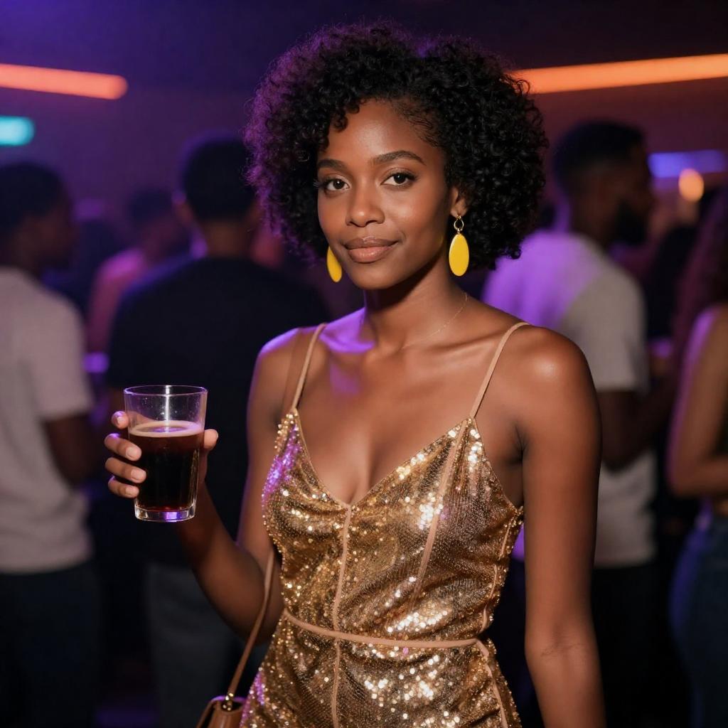 Portrait of a young Black woman with dark skin and curly afro hairstyle wearing a gold sequined dress and yellow earrings. She is holding a glass of a dark beverage, standing in a dimly lit nightclub with purple and orange ambient lighting. The background features blurred people socializing.