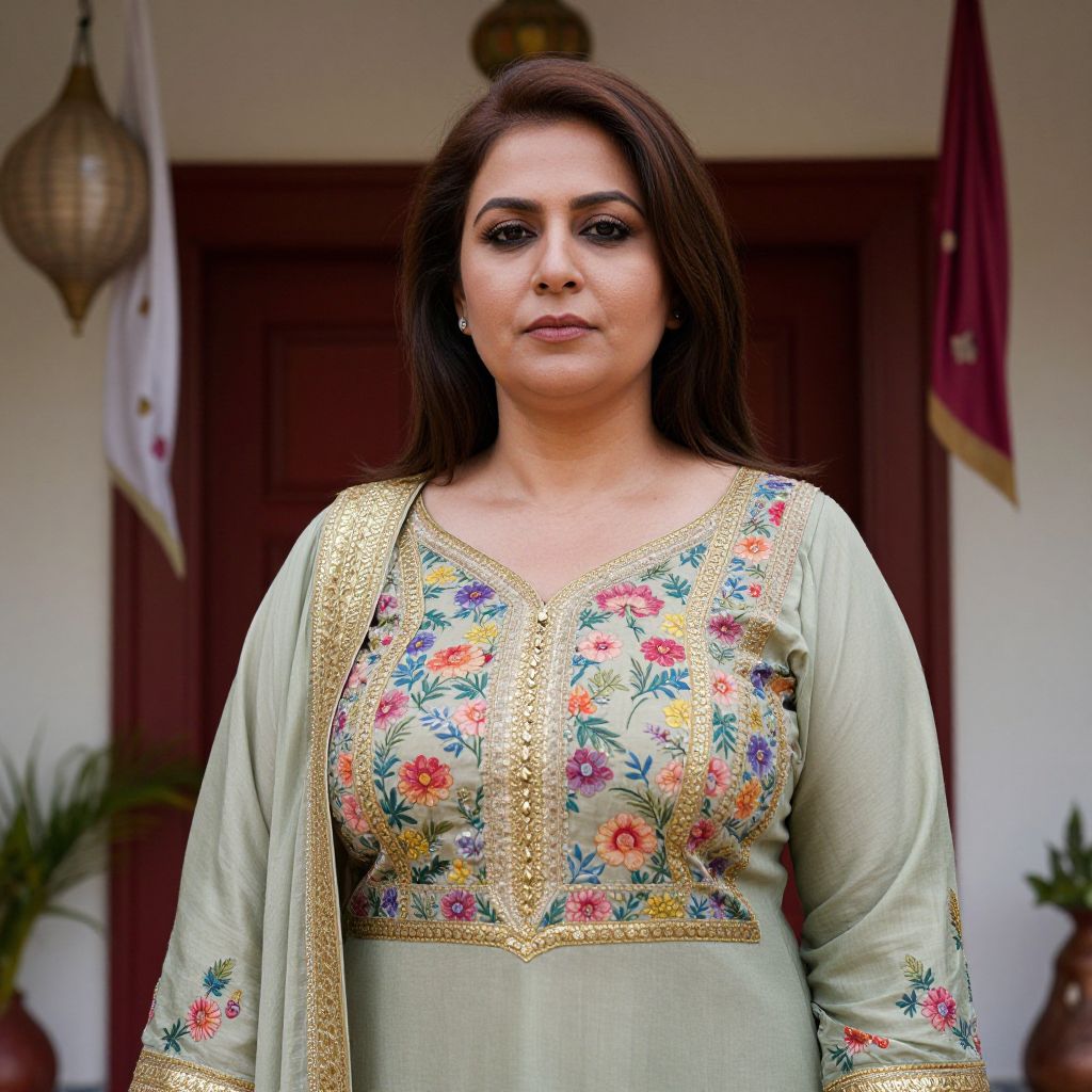 Photograph of a confident Indian woman with medium skin tone, brown hair, wearing a light green embroidered traditional outfit with floral patterns, standing in front of