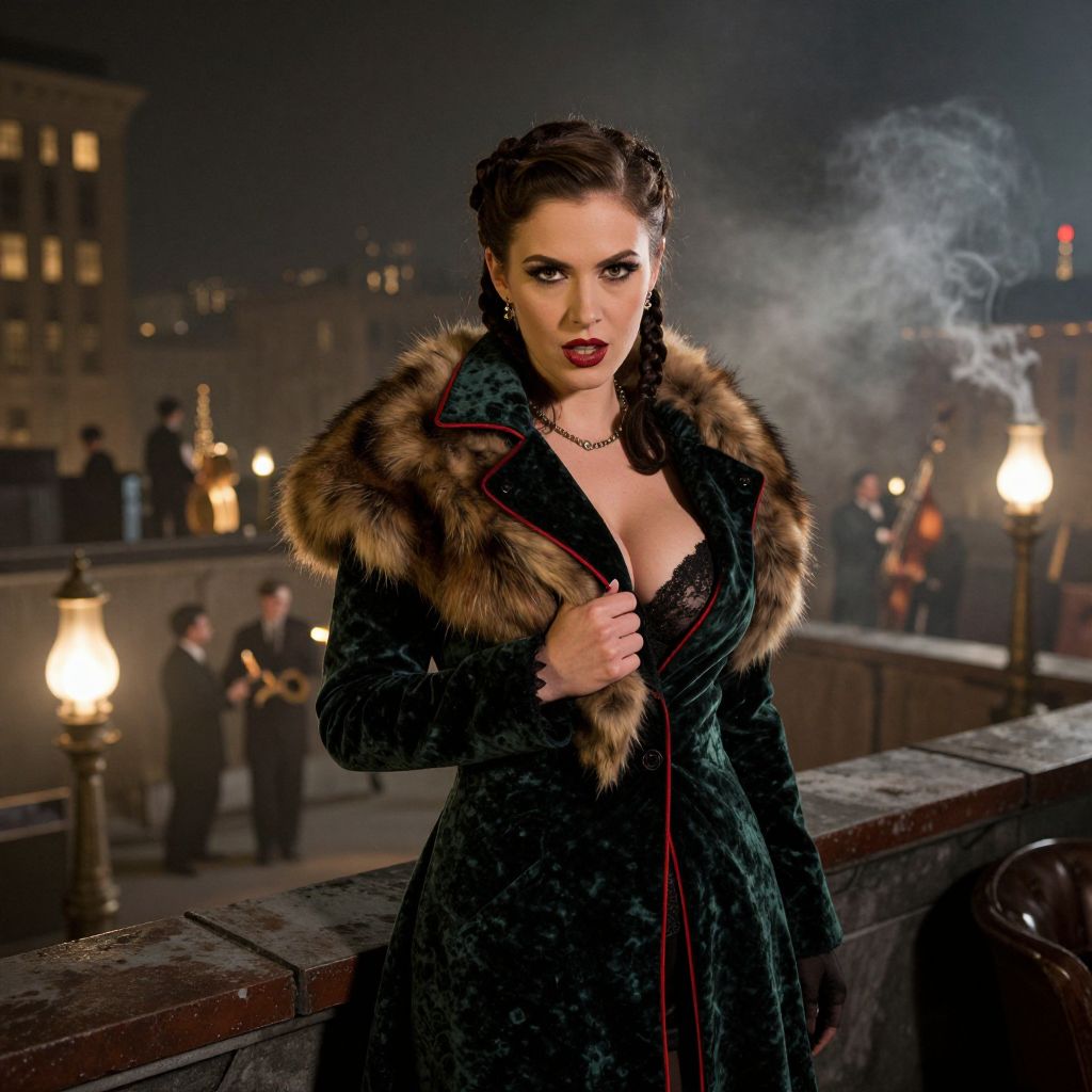 A woman in her late 20s with a sharp, mischievous expression and braided hair pulled back, dressed as a 1920s gangster moll in a dark green velvet coat with red piping, a fur stole wrapped tightly around her, standing on a rooftop looking over a smoky city at night, the city lit with gas lamps and jazz bands in the distance, the atmosphere gritty, moody, and full of rebellion and edge.. The woman has big tits and cute face