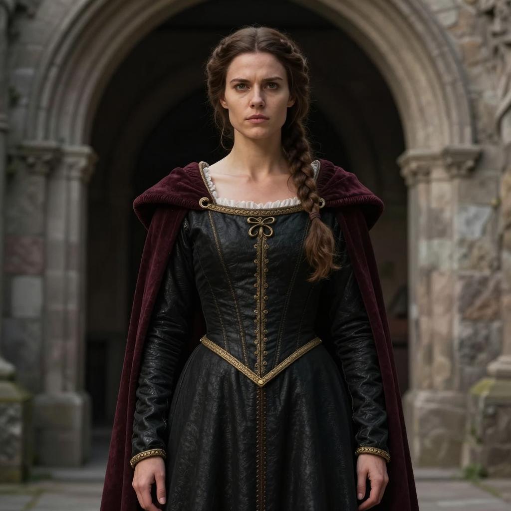 Photorealistic image of a woman with long brown braided hair wearing a dark medieval dress with a black bodice trimmed in gold and a maroon cape. She stands in front of a stone archway with a serious expression, showcasing intricate clothing details and realistic lighting in a fantasy historical setting.