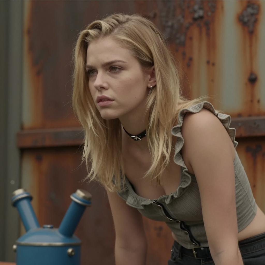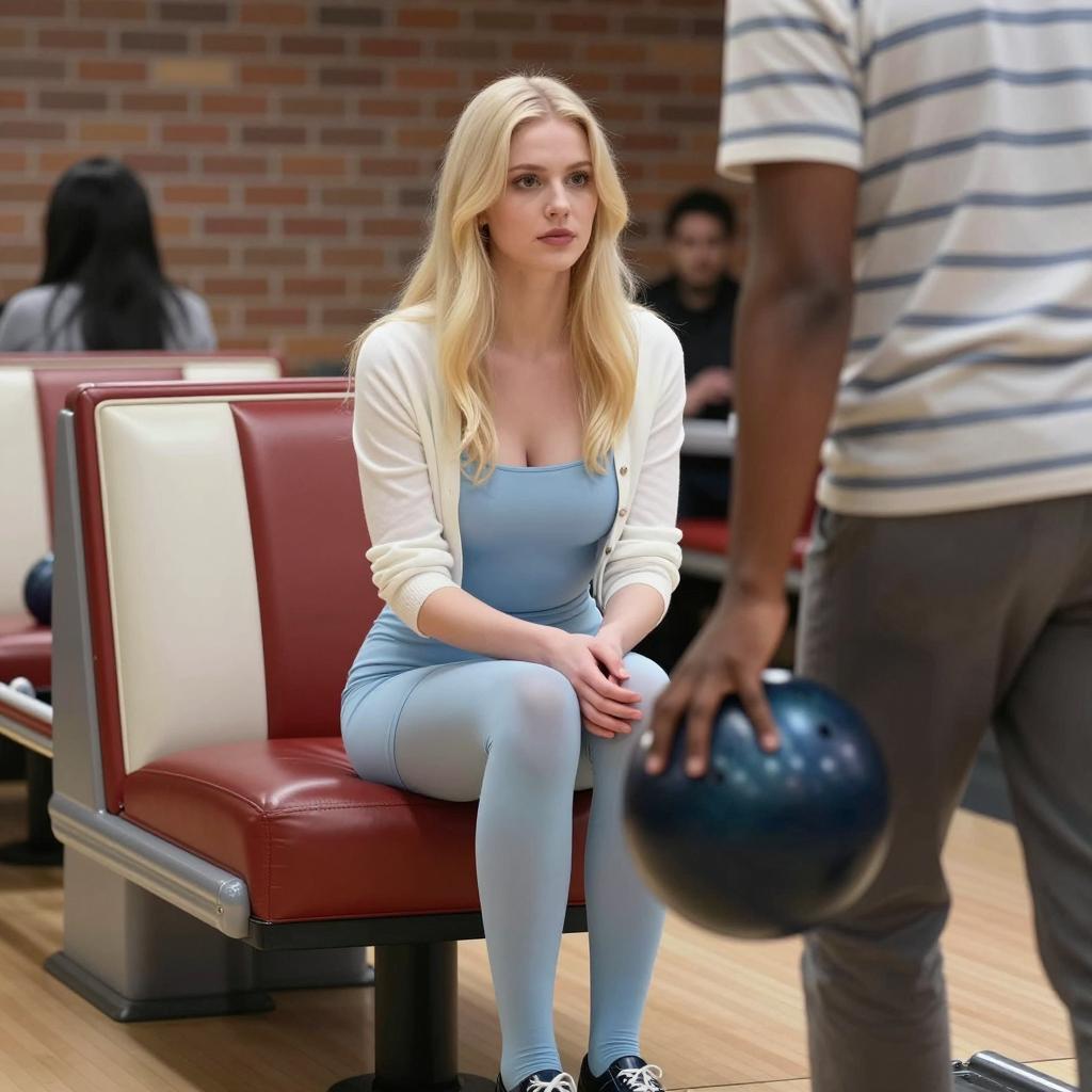 Blonde woman with pale skin and medium-sized breasts sits on a red and white booth, wearing a light blue strapless dress, white cardigan, and light blue tights. She looks slightly to the right. A person with dark skin and wearing a striped shirt and gray pants stands in the foreground, holding a black bowling ball. Background includes a brick wall and additional booths. Indoor setting. Two people.