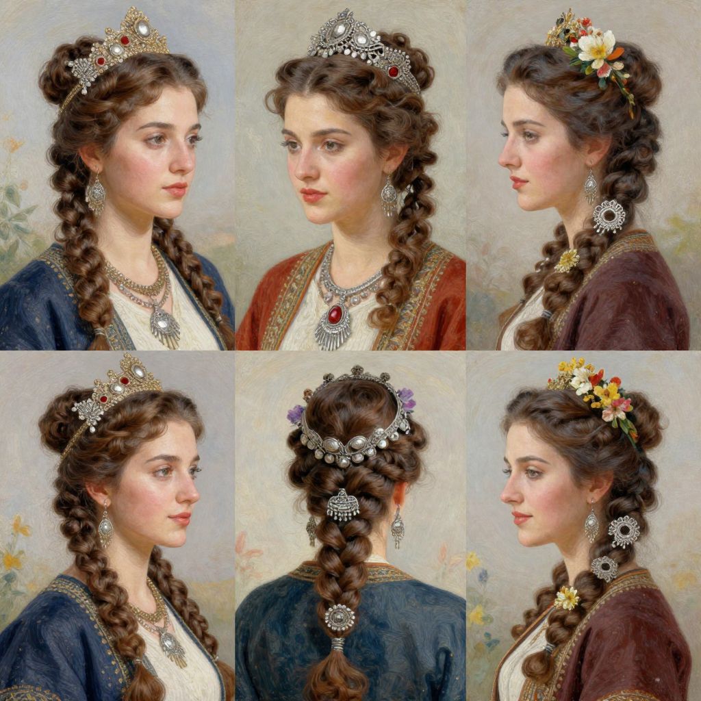 Portrait of a young Armenian woman with traditional hairstyles, featuring elaborate braids and decorated with handmade ribbons and headpieces, surrounded by historical Armenian symbols and motifs in a richly textured oil painting style.