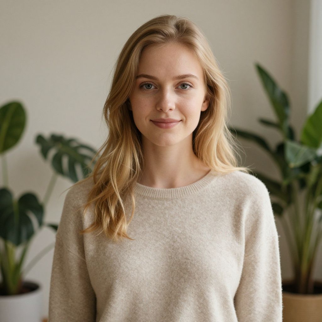 Photograph of a young Caucasian woman with fair skin and wavy, shoulder-length blonde hair. She has light blue eyes, a subtle smile, and is wearing a beige, long-sleeved knit sweater. The background is softly blurred, featuring two large green potted plants with broad leaves, one on the left and one on the right, set against a plain white wall. The lighting is natural, creating a warm and inviting atmosphere. The woman is centered in the frame, and the overall composition is simple and elegant.