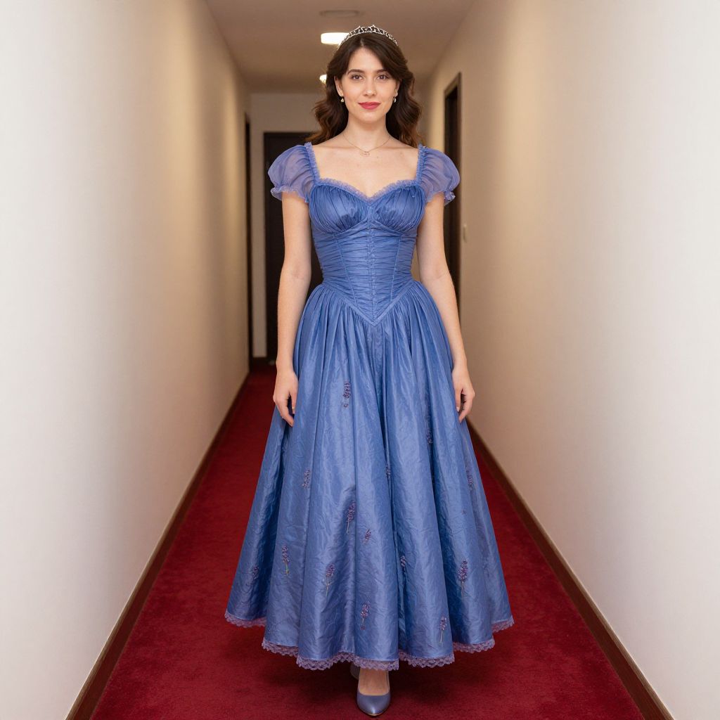 Lavender Costume, woman in a blue dress standing in a hallway with a red carpet
