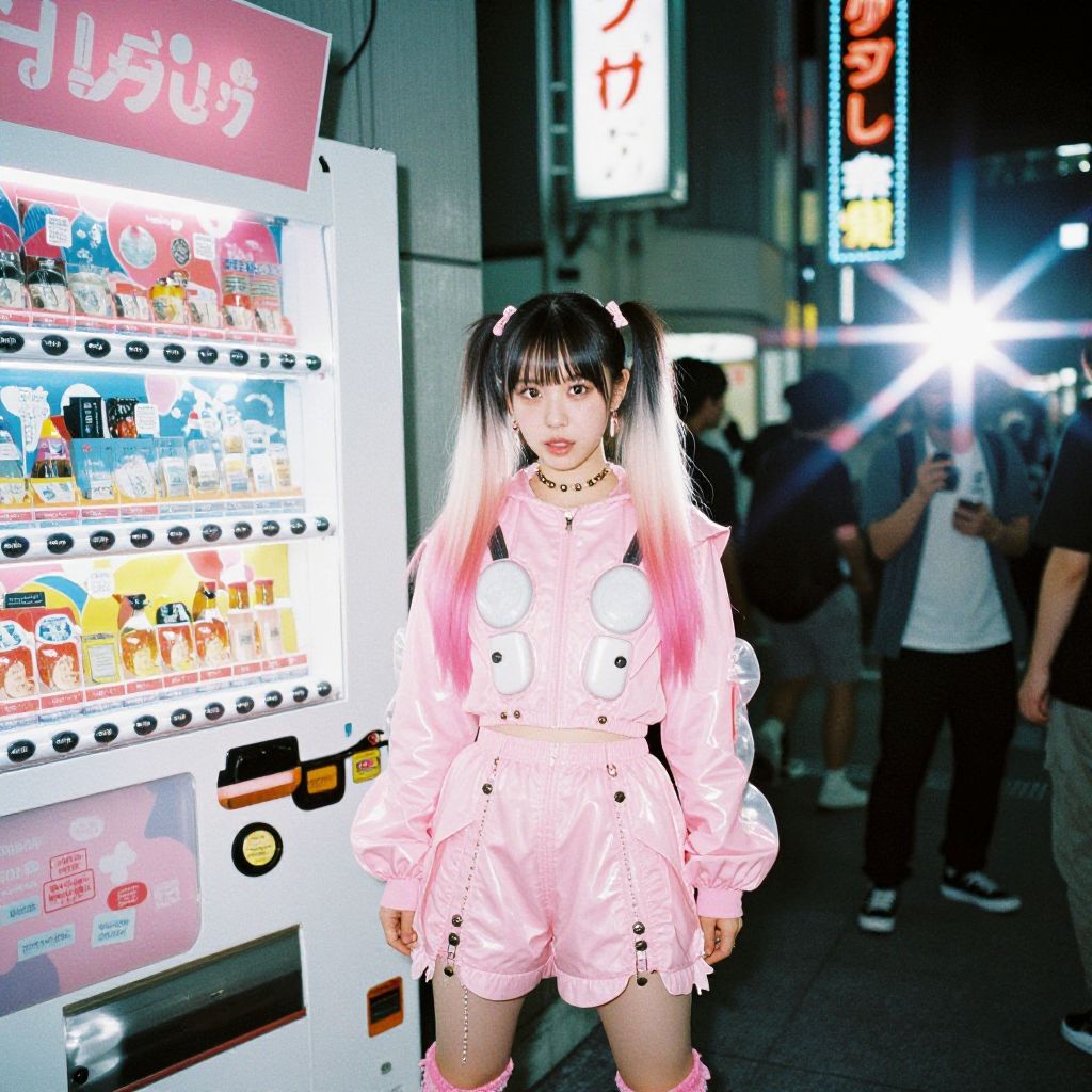 Tokyo fashion, film grain, high ISO photo grain, Japanese vending machines, Young Japanese Woman, Wearing futuristic pink outfit, neon lights, neon signs, Pink and white gradient hair, Twintails, album cover, photo art, harajuku style, graphic design, photo shoot, band photo shoot, behind-the-scenes, fun, silly, at shibuya station, grunge, flash photography, light leak, motion blur