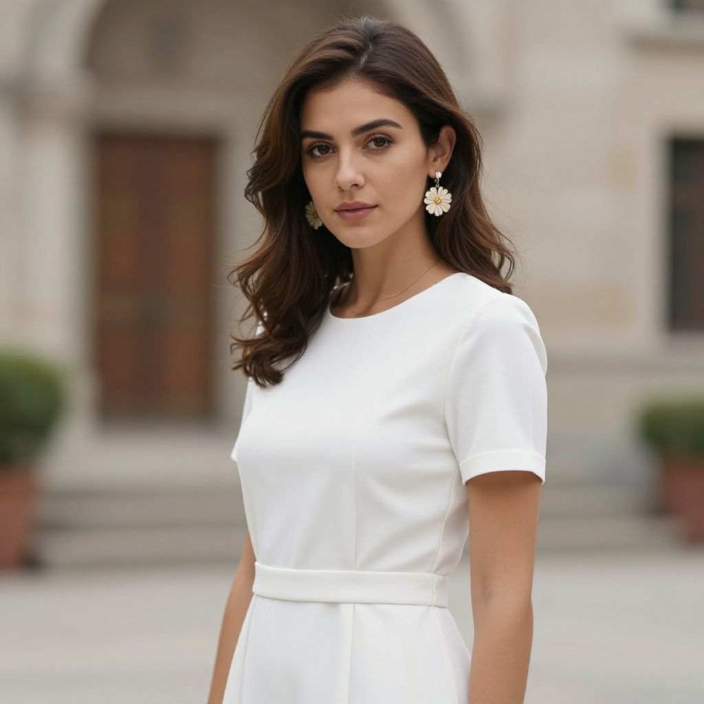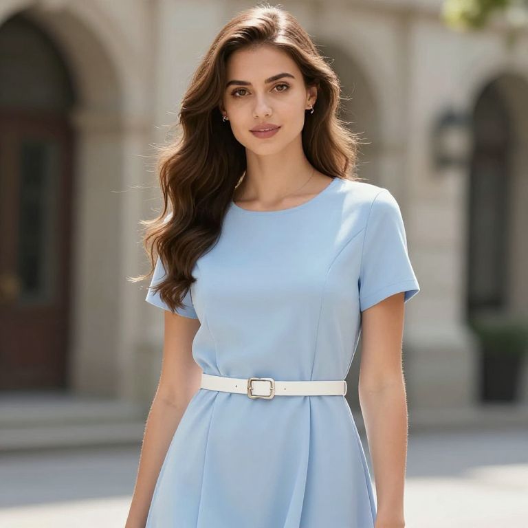 Girl with long brown hair wearing a light blue dress with a white belt.