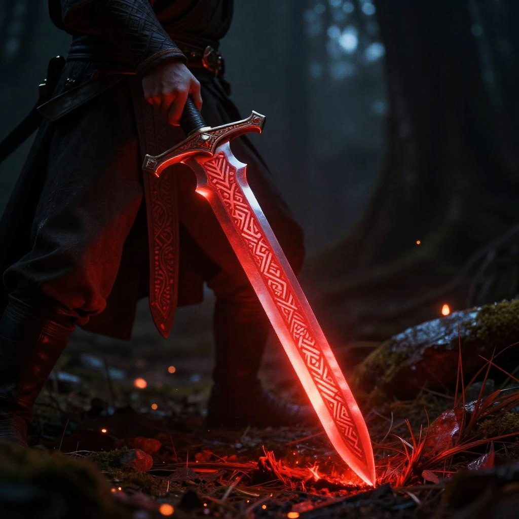 Red glowing sword held by a warrior in a dark mystical forest, illuminated by fiery embers, intricate ancient runes etched into the blade, vibrant red light casting dynamic shadows, mystical atmosphere, high detail fantasy scene