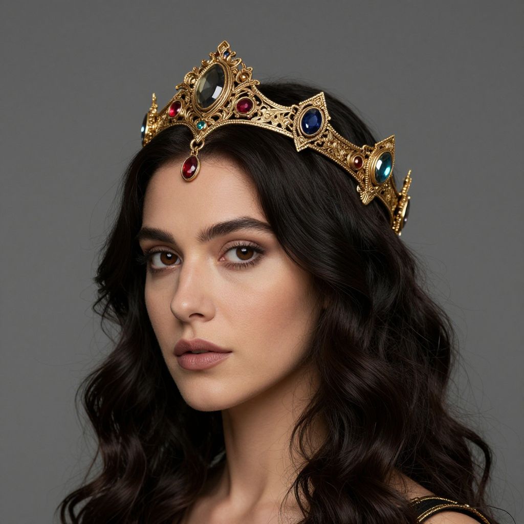 Woman wearing an ornate gold Elven Medieval Crown Headdress Tiara Circlet by AMonSeulDesir, featuring intricate detailing and colorful gemstones set against her dark, wavy hair.