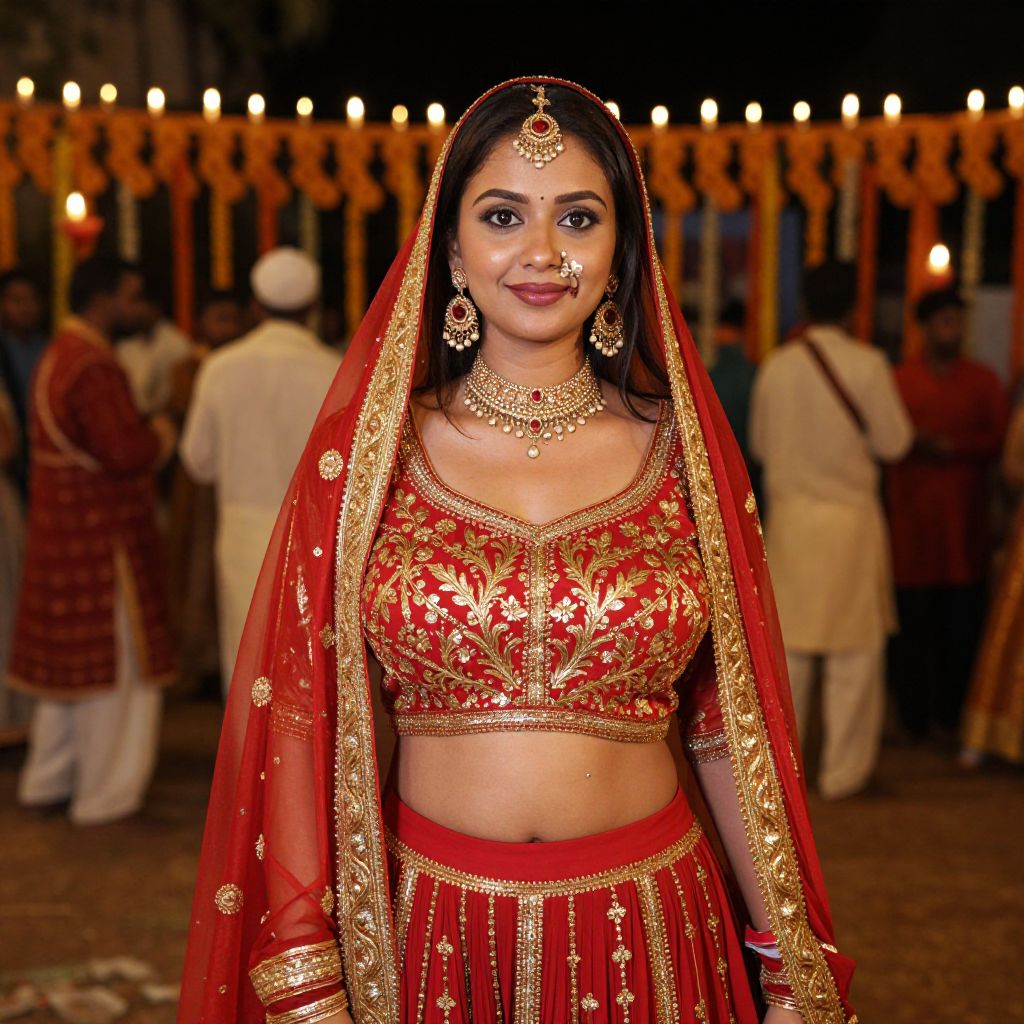 A vibrant and traditional garba outfit costume featuring bright red and gold colors, worn by a young woman with a warm brown complexion, deep brown eyes, and a smiling expression, standing in the center of a lively Gujarati festival ground at night with candles and traditional decorations in the background.. The woman has big tits and cute face