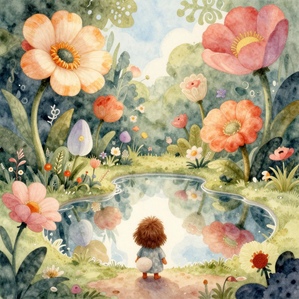 A whimsical watercolor scene captures a surreal circus viewed from above, with a dreamlike gradient evoking both joy and melancholy. The sky is filled with fantastical creatures blending human and animal features, as acrobats perform gravity-defying stunts among floating lanterns in the bright blue expanse. A solitary figure sits pensively on a cloud below, their deep contemplation mirrored in the soft, intense hues of the watercolor. This enchanting tableau invites viewers to explore its dreamlike surface and ponder hidden meanings beneath the whimsical elements.