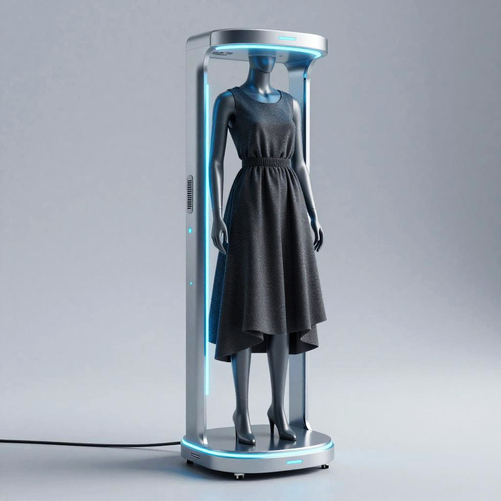 Free clothing remover concept, futuristic fashion device effortlessly removing layers of clothes from a mannequin, sleek metallic design with glowing blue lights, minimalistic background, high-tech ambiance, digital art style