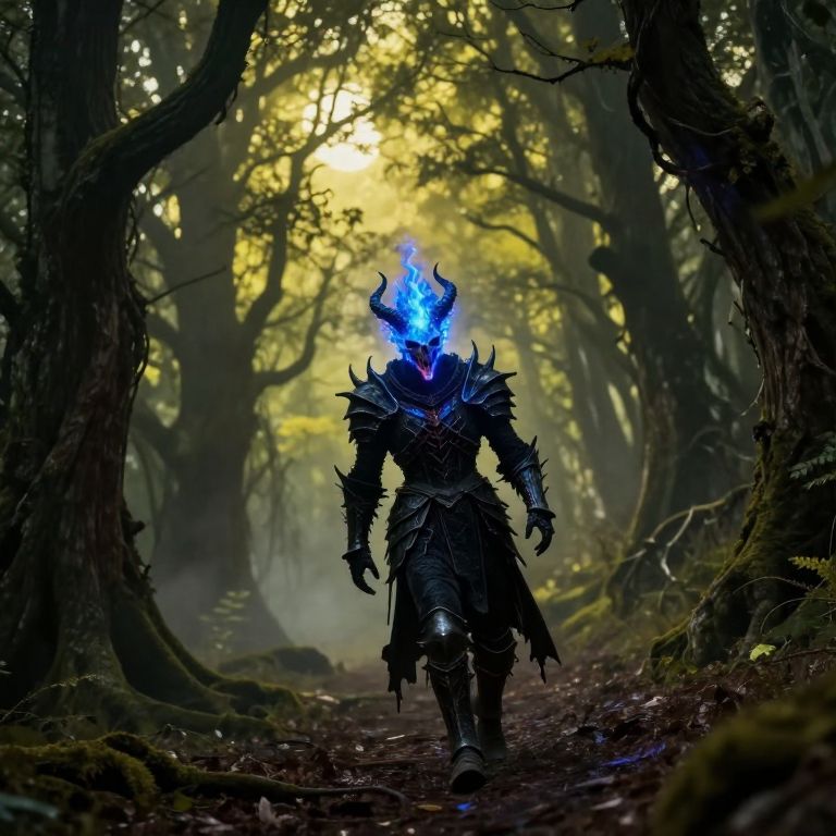 A digital fantasy artwork depicts a dark armored warrior with a glowing blue, horned helmet standing on a forest path. The warrior's armor is heavily spiked and black, contrasting with the ethereal blue flame emanating from the helmet. The forest background is dense with tall, twisted trees, illuminated by a soft, yellowish light filtering through the leaves. The path is dark and moss-covered, leading the viewer's eye towards the imposing figure. The overall atmosphere is mysterious and otherworldly.