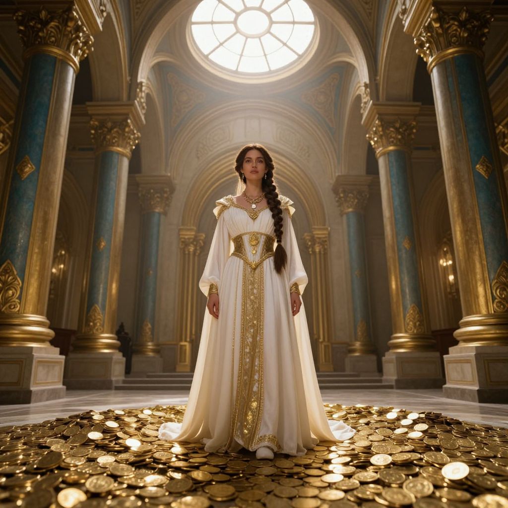 In a vaulted room filled with an abundance of gold coins, a beautiful woman stands regally, her white robe adorned with gold accents. The room is illuminated by a soft, warm light filtering through a large, circular window at the top, casting a golden glow on the scene. The woman's long, braided hair cascades down her back, and she wears a delicate gold necklace. Piles of gold coins are scattered around her feet, creating a sense of wealth and opulence. The room is lined with tall, ornate columns, their blue and gold hues adding to the grandeur of the setting. The overall composition is balanced, with the woman centrally positioned, the coins creating a sense of depth and perspective, and the columns framing the scene. The interplay of colors, textures, and shapes creates a rich, detailed visual experience, evoking a sense of fantasy and adventure reminiscent of the Forgotten Realms.