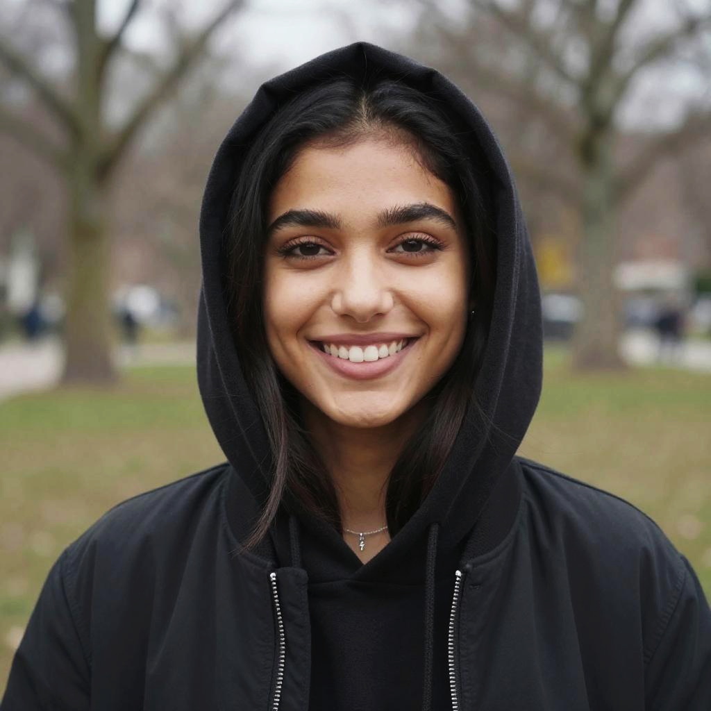 Photograph of a young woman with light olive skin and dark straight hair, smiling warmly. She's wearing a black hoodie with the hood up and a black jacket over it. Her dark eyes are accentuated with subtle makeup, and she has a small silver necklace. The background is a blurred park with bare trees and a grassy field, giving a cool, overcast feel.
