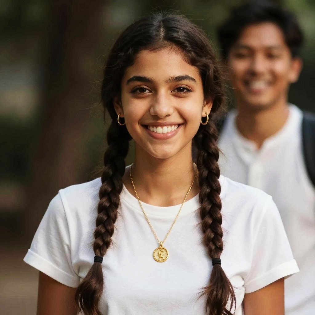 Photograph of a young woman with medium brown skin and dark, straight hair, smiling broadly. She has thick, dark eyebrows, expressive brown eyes, and a small nose. She wears a black hooded sweatshirt with the hood up, partially covering her hair. The background is a blurred, outdoor park setting with bare trees and a grassy field, suggesting a cool season. The overall image has a soft focus effect, emphasizing the subject's cheerful expression. The lighting is natural, and the colors are muted, enhancing the casual, everyday atmosphere.