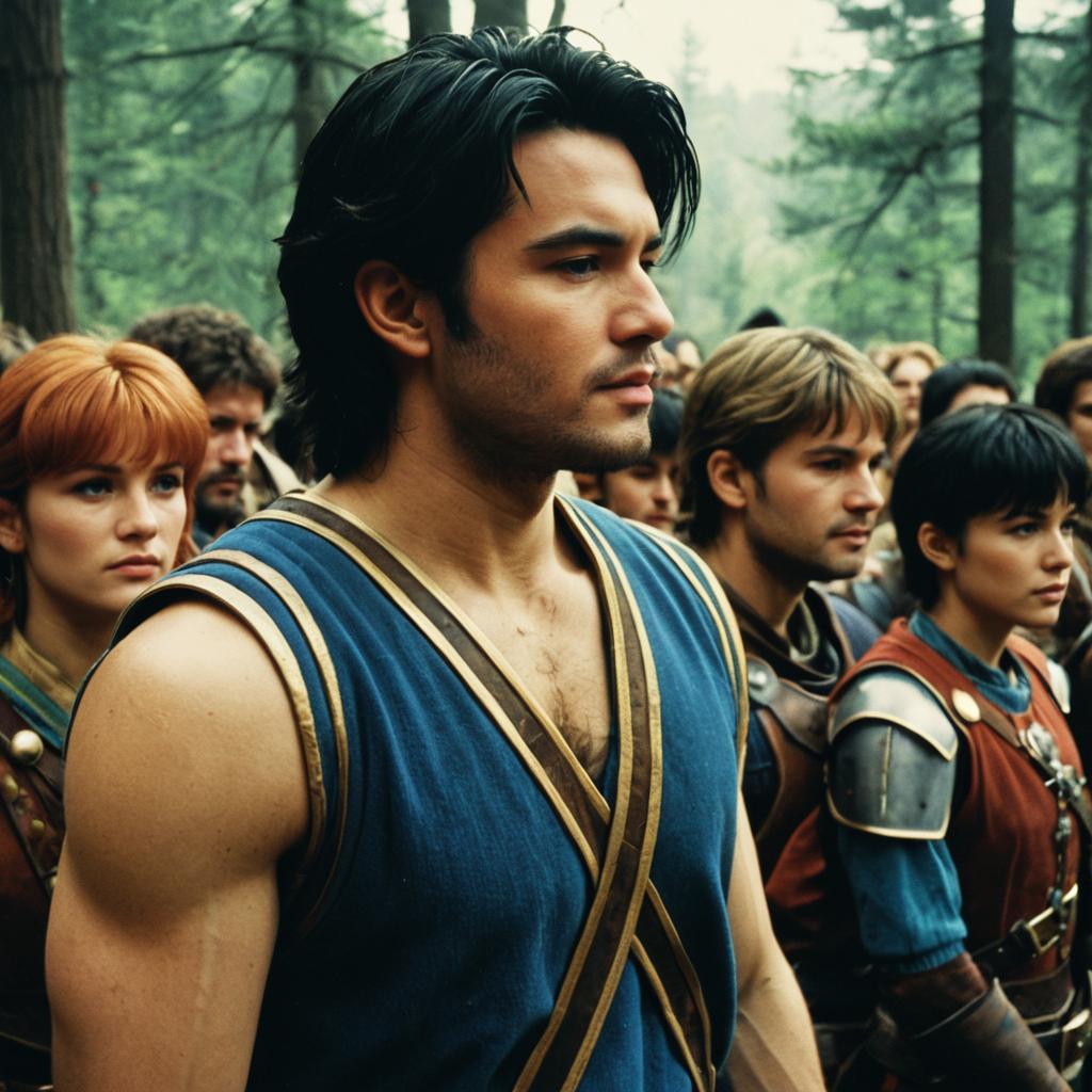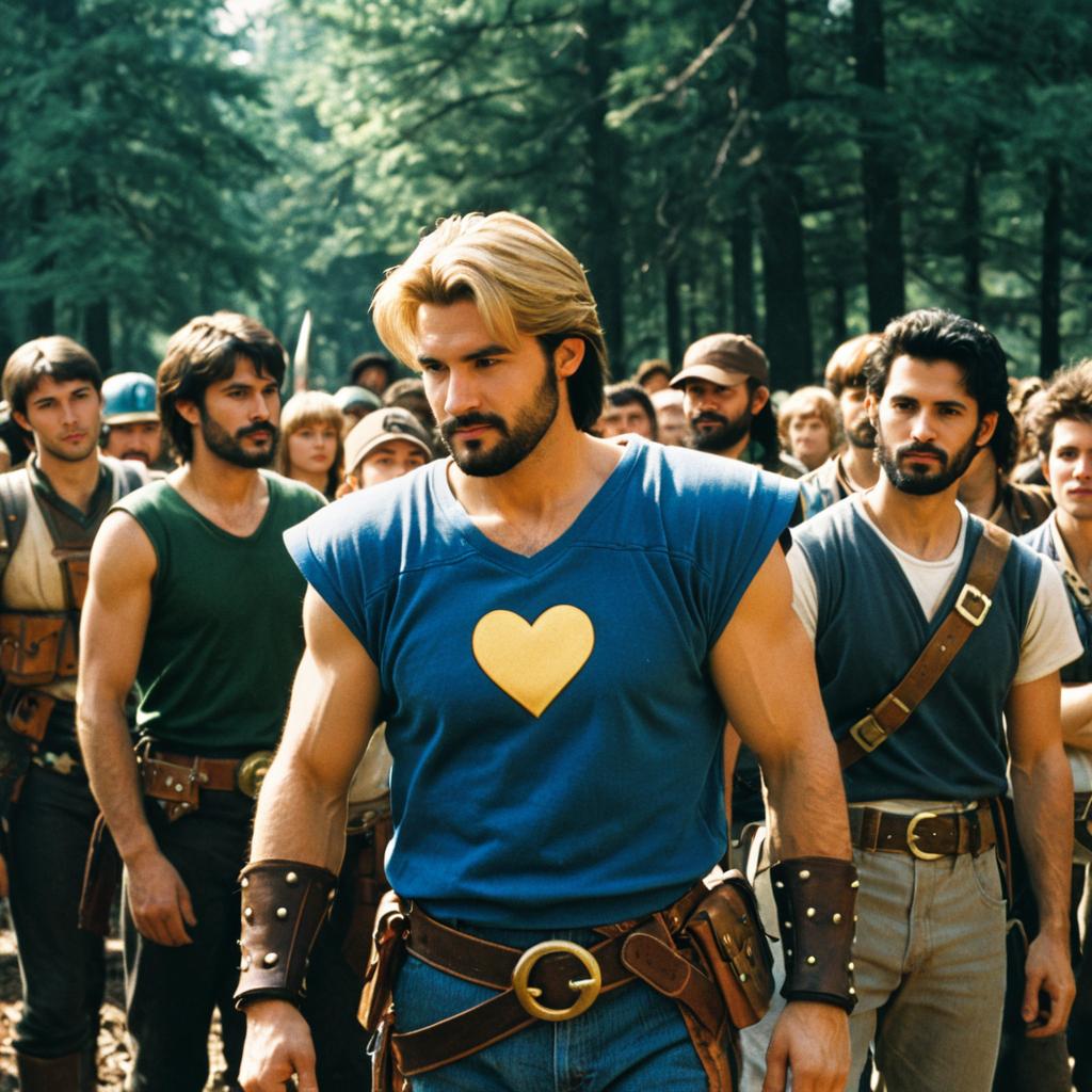 A group of medieval fantasy warriors, including a blonde male leader dressed in a blue tunic and leather armor, standing in a forest. The group consists of men and women equipped with armor, belts, and weapons such as spears and swords, portraying a heroic and adventurous scene.