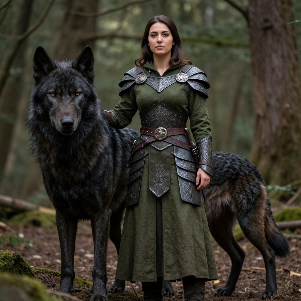 Photograph of a dark-haired woman in medieval armor, standing in a forest, hand on a large, black wolf with piercing eyes.