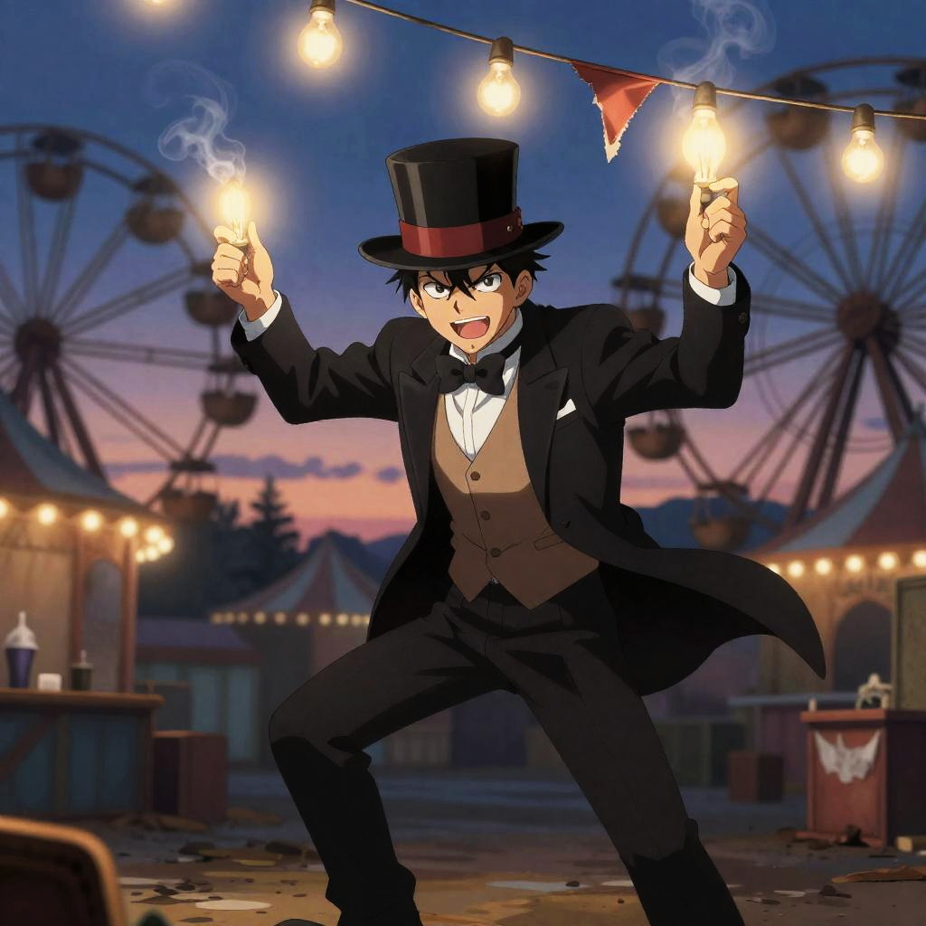 Dynamic illustration of a cunning street magician in the signature style of Tatsuki Fujimoto, featuring flickering fairground bulbs with smoky incandescent glow and a background filled with forgotten twilight carnival with a rusting ferris wheel and torn banners