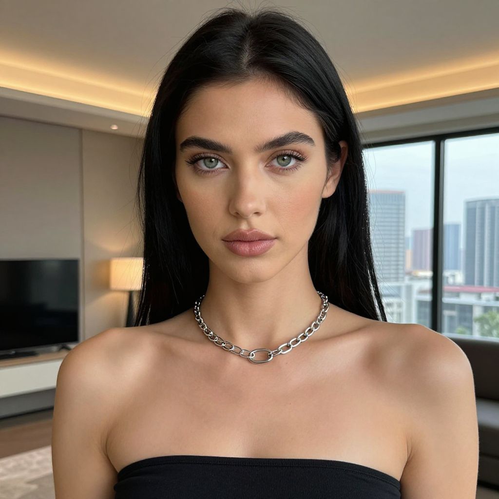 A stylish woman in her late 20s with long black hair and confident green eyes wearing a minimalist silver chain necklace made of intertwined links, standing in a modern urban apartment with warm lighting and city skyline views in the background.