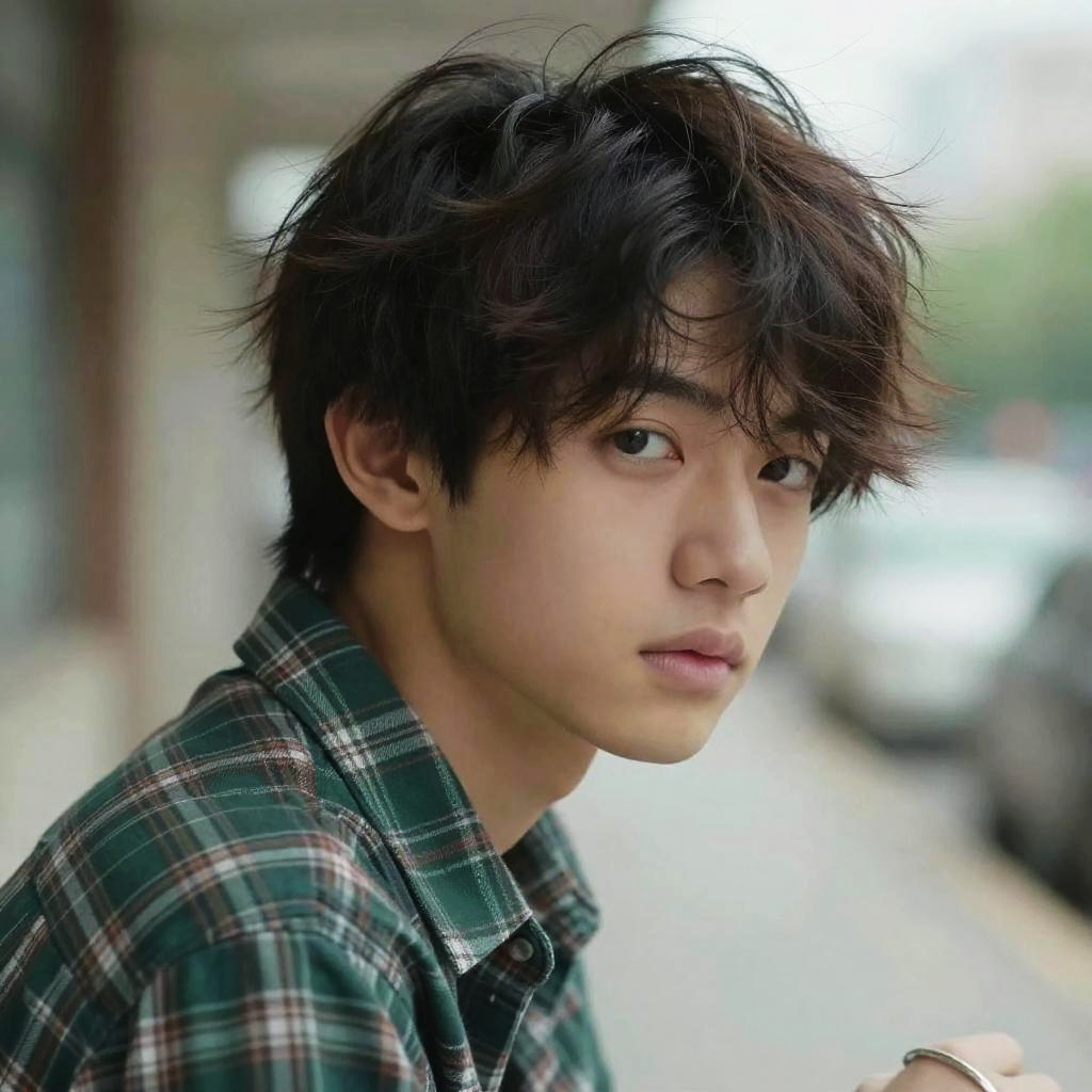 Realistic photo.An image of a young man, with a soft, natural complexion and a messy hairstyle, featuring tousled locks falling over his forehead. He poses semi-profile, facing slightly to the right, with his gaze meeting the camera. He wears a casual green plaid shirt and a simple silver bracelet. The lighting is soft and natural, accentuating his thoughtful expression, against a softly blurred background. realistic photo